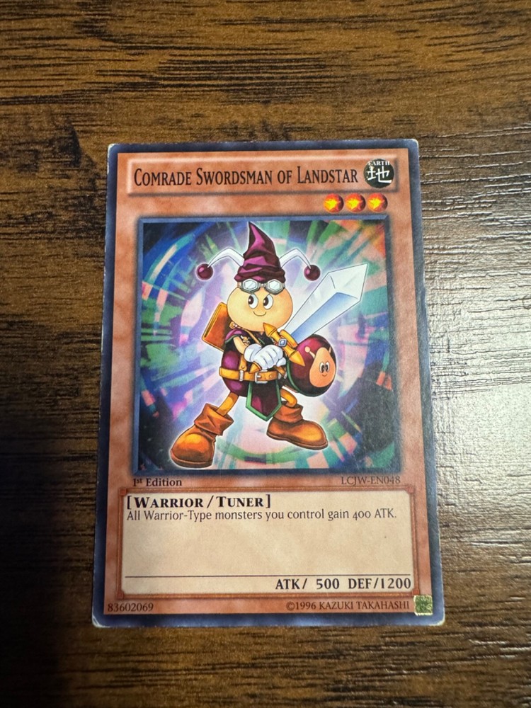This rare and highly sought-after Comrade Swordsman of Landstar card from the Yu-Gi-Oh! TCG is part of the Legendary Collection 4: Joey's World set. It features a warrior creature type with 1200 defense/toughness and 500 attack/power. The card is a first edition, English language, common/short print rarity, and has the card number LCJW-EN048. This card is perfect for collectors and players alike, and is manufactured by Konami. It is a tuner card that can help Joey win his battles in the Yu-Gi-Oh! TCG. Don't miss your chance to add this rare card to your collection today!