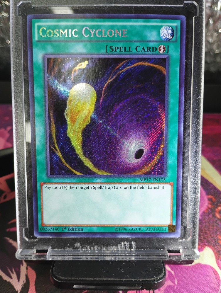 Take your Yu-Gi-Oh! TCG gameplay to the next level with the Cosmic Cyclone card. This Secret Rare Spell-Quick Play card from the 2017 Mega-Tins Mega Pack is a must-have for any serious player or collector. With its powerful effect, you can turn the tide of any game in your favor. This English language card has the card number MP17-EN105 and is a 1st Edition. Manufactured by Konami, this card is a great addition to any collection. Don't miss out on the opportunity to own this rare card.