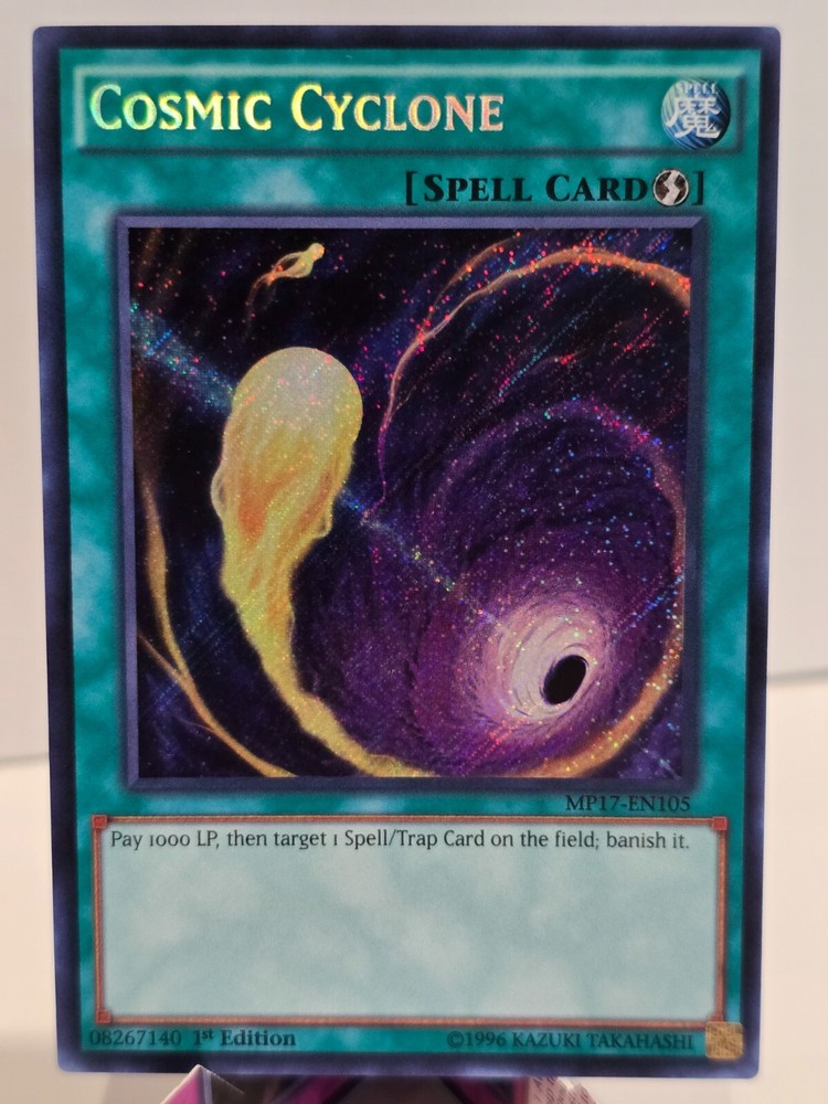 The Cosmic Cyclone MP17-EN105 card is a 2017 1st Edition Yu-Gi-Oh! trading card from the Mega-Tins Mega Pack set. Manufactured by Konami, this Secret Rare English-language card is a Spell-Quick Play type with a cosmic theme. It is a highly sought-after collectible for fans of the Yu-Gi-Oh! TCG, offering a unique gameplay experience to players looking to enhance their decks with rare and powerful cards.