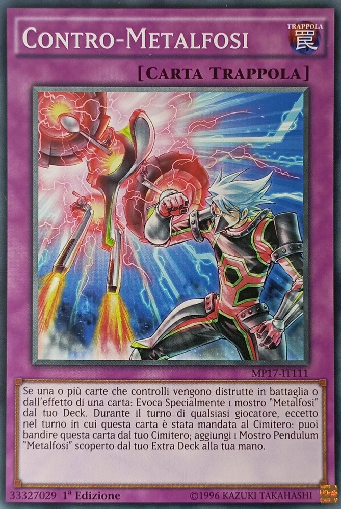 Contro-Metalfosi - Comune - 2017 Mega-Tin Mega Pack - MP17-IT111 - Ita - Nuovo Contro-Metalfosi - Comune - 2017 Mega-Tin Mega Pack - MP17-IT111 - Ita - Nuovo Se una o più carte che controlli vengono distrutte in battaglia o dall’effetto di una carta: Evoca Specialmente 1 mostro “Metalfosi” dal tuo Deck. Durante il turno di qualsiasi giocatore, eccetto nel turno in cui questa carta è stata mandata al Cimitero: puoi bandire questa carta dal tuo Cimitero; aggiungi 1 Mostro Pendulum “Metalfosi” scoperto dal tuo Extra Deck alla tua mano. Shipping Shipping cost: Italy Posta 1 -> 2,95 Corriere Espresso -> 5,99 Outside Italy Priority - 8,00 Delivery time: La Spedizione Viene Effettuata entro i 5 giorni successivi al pagamento dell'ordine. Payment Per qualsiasi info contattateci Service Per qualsiasi info contattateci