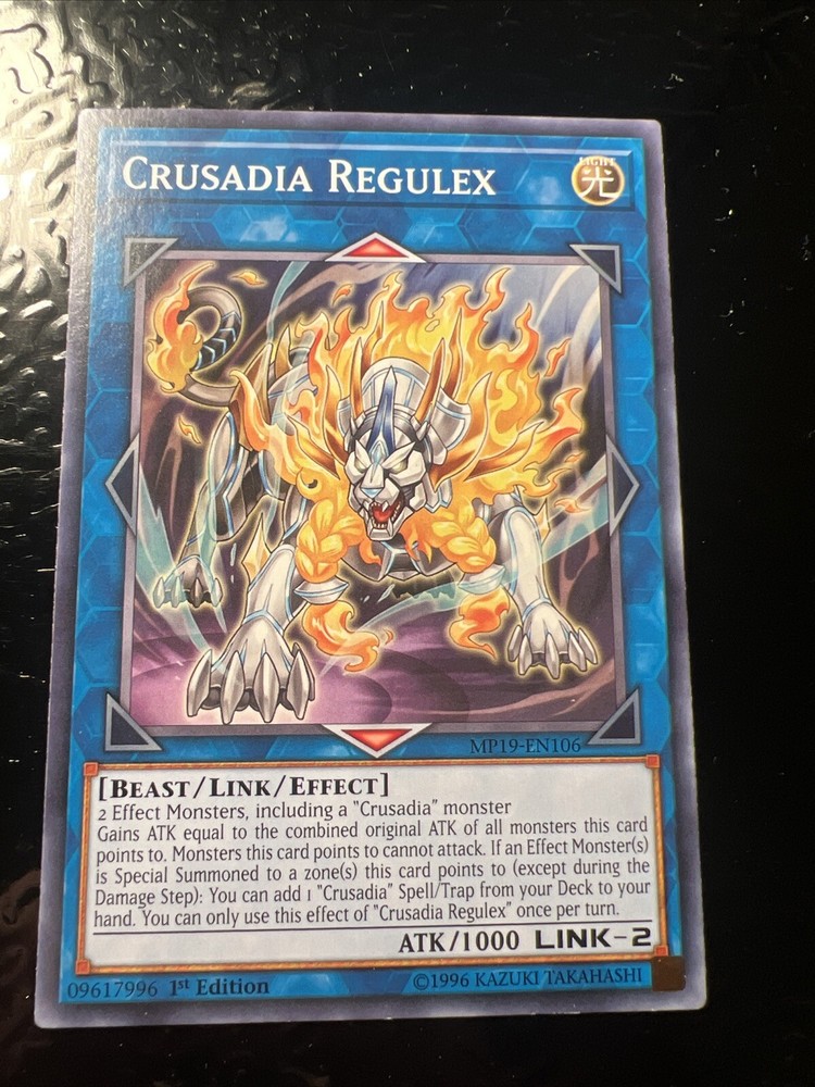 Enhance your Yu-Gi-Oh! TCG collection with the Crusadia Regulex card from the 2019 Gold Sarcophagus Tin Mega Pack. This effect/link card, with its beast creature/monster type, boasts an attack power of 1000 and is a common/short print rarity. The card is in English language and has the card number MP19-EN106. This card is a must-have for any Yu-Gi-Oh! TCG player or collector. Manufactured by Konami, the Crusadia Regulex card is an unlimited feature that will improve your game play. Get your hands on this card and add it to your collection today!