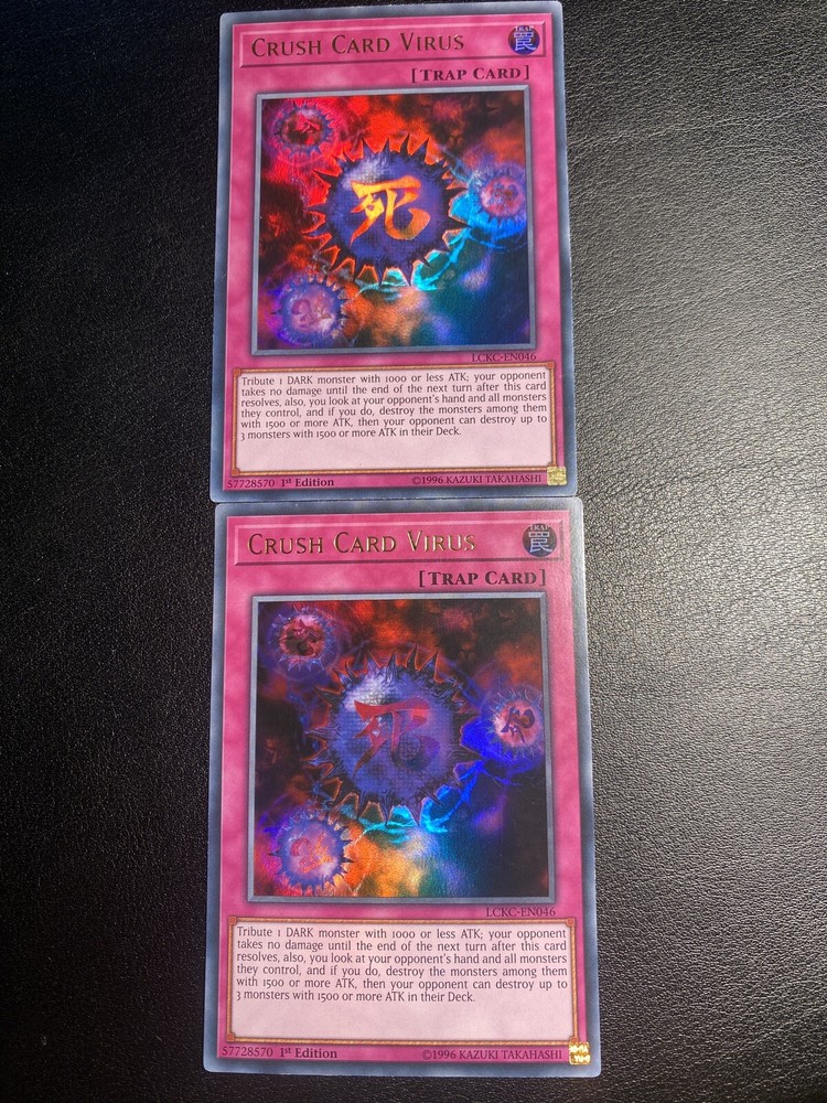 This Crush Card Virus is a must-have for any Yu-Gi-Oh! TCG collector. With its Ultra Rare rarity and 1st Edition features, this Trap-Normal card is sure to impress. The card is in English language and belongs to the Legendary Collection Kaiba set. The card's number is LCKC-EN046 and it is manufactured by Konami. Its attribute is Trap and it is perfect for those who enjoy CCG Individual Cards. Don't miss out on the chance to add this Crush Card Virus to your collection.