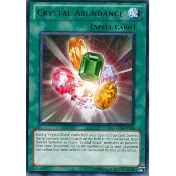 Crystal Abundance - LCGX-EN166 - Rare - Unlimited Edition Image is a stock photo of the card. You will receive the card in Moderately Played condition Condition: Moderately Played ATK/DEF : Ability : Attack #1 : Attack #2 : Attack #3 : Attribute : Spell Card Number : LCGX-EN166 Card Rules : Card Text : Send 4 "Crystal Beast" cards from your Spell & Trap Card Zone to the Graveyard. Send all cards on the field to the Graveyard. Then, Special Summon as many "Crystal Beast" monsters as possible from your Graveyard, up to the number of your opponent's cards that were sent to the Graveyard by this card's effect. Card Type : Normal Spell Edition : Unlimited Finish : HP : Illustrator : Level : Manufacturer : Monster Type : Name : Crystal Abundance Passcode : 72881007 Pendulum Scale : Rarity : Rare Resistance : Retreat Cost : Set : Legendary Collection 2 Stage : Weakness : Be sure to visit our store for a wide selection of your favorite cards! We are running specials RIGHT NOW!! Shipping Options: ~Ships in a regular white envelope with a stamp for FREE! (THERE IS NO TRACKING INFORMATION AVAILABLE FOR THE ABOVE METHOD. SHIPPING TIME IS 4-10 BUSINESS DAYS) ~Ships in a TRACKEDbubble mailer for $5.99! ~Shipments are handled same or next business day. ~FREE SHIPPING for each additional card, so shop around our store!