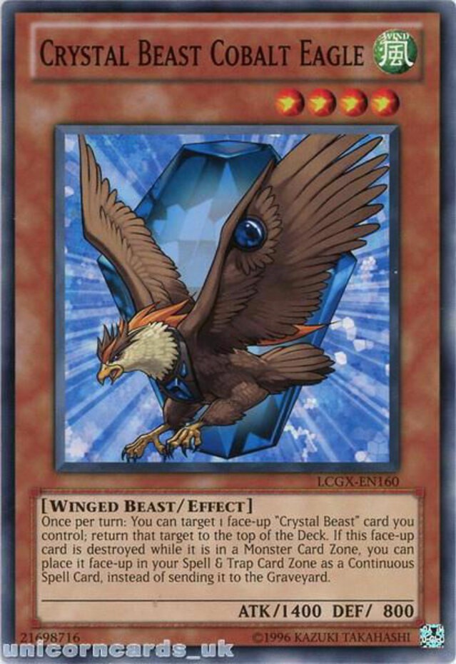 Crystal Beast Cobalt Eagle - LCGX-EN160 - Common - Unlimited Edition Image is a stock photo of the card. You will receive the card in Moderately Played condition Condition: Moderately Played ATK/DEF : 1400/800 Ability : Attack #1 : Attack #2 : Attack #3 : Attribute : Wind Card Number : LCGX-EN160 Card Rules : Card Text : Once per turn, you can return 1 face-up "Crystal Beast" card you control to the top of its owner's Deck. If this card is destroyed while it is in a Monster Card Zone, you can place it face-up in your Spell & Trap Card Zone as a Continuous Spell Card, instead of sending it to the Graveyard. Card Type : Effect Monster Edition : Unlimited Finish : HP : Illustrator : Level : 4 Manufacturer : Monster Type : Winged Beast Name : Crystal Beast Cobalt Eagle Passcode : 21698716 Pendulum Scale : Rarity : Common Resistance : Retreat Cost : Set : Legendary Collection 2 Stage : Weakness : Be sure to visit our store for a wide selection of your favorite cards! We are running specials RIGHT NOW!! Shipping Options: ~Ships in a regular white envelope with a stamp for FREE! (THERE IS NO TRACKING INFORMATION AVAILABLE FOR THE ABOVE METHOD. SHIPPING TIME IS 4-10 BUSINESS DAYS) ~Ships in a TRACKEDbubble mailer for $5.99! ~Shipments are handled same or next business day. ~FREE SHIPPING for each additional card, so shop around our store!