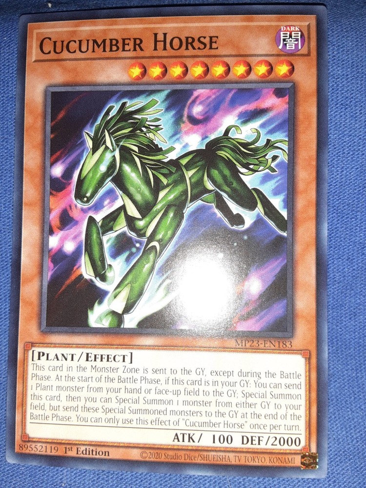 The product is a "Cucumber Horse" card from the Yu-Gi-Oh! TCG Anniversary Pack set, specifically from the 25th Anniversary Tin: Dueling Heroes. It features a Hero monster with a Dark attribute and a 1st Edition printing by Konami. The card has a regular finish and is part of the Yu-Gi-Oh! TCG. This collectible card is likely a special edition release to commemorate the 25th anniversary of the game.