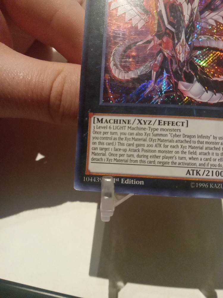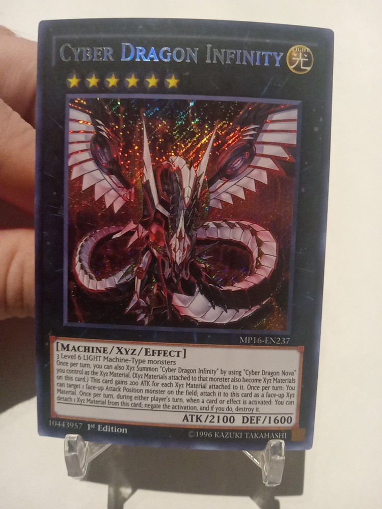 Cyber Dragon Infinity is a Secret Rare card from the 2016 Mega-Tins Mega Pack in the Yu-Gi-Oh! TCG. It is a Machine-Type Xyz Effect Monster with 2100 Attack and 1600 Defense. The card number is MP16-EN237 and it is in English. It was manufactured by Konami as a 1st Edition release.