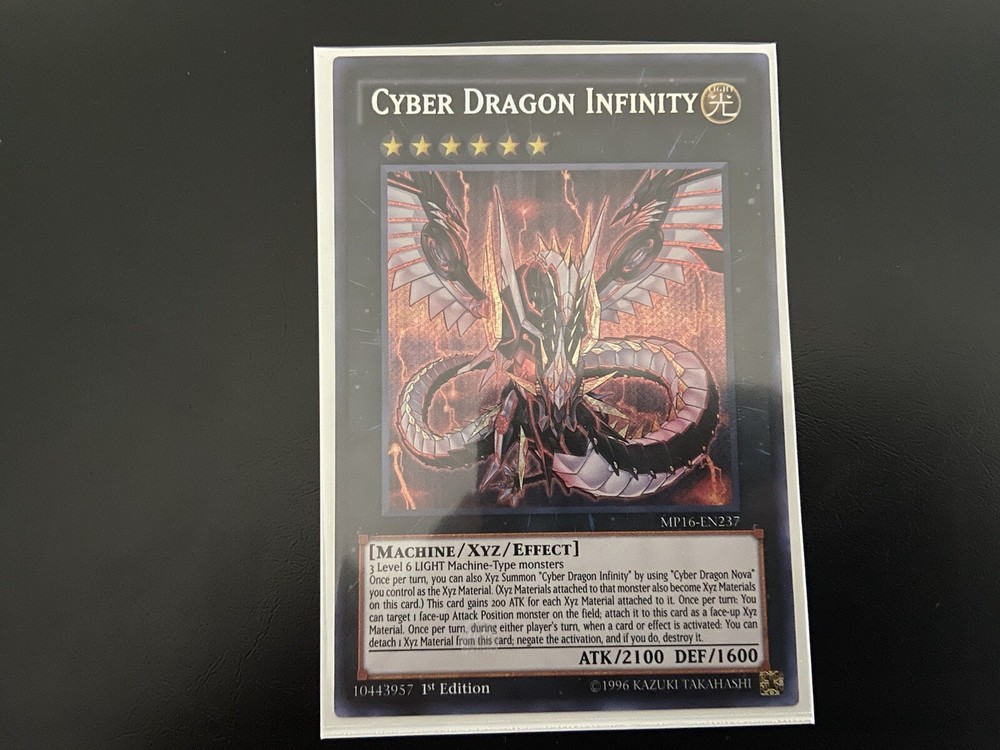 This rare and highly sought-after card is a must-have for any Yu-Gi-Oh! TCG collector. Its stunning art and powerful 2100/1600 attack and power make it a force to be reckoned with on the battlefield. The Cyber Dragon Infinity card is part of the 2016 Mega-Tins Mega Pack set and is a Secret Rare 1st Edition, featuring the rare edition design. It is an Xyz type card with card number MP16-EN237 and is in near mint condition, ready to be added to your collection. This English language card is manufactured by Konami in the United States and features a machine monster type with light color attribute. It is a standard size card with professional grader rating of Rare. Don't miss out on the opportunity to own this incredible piece of Yu-Gi-Oh! TCG history!