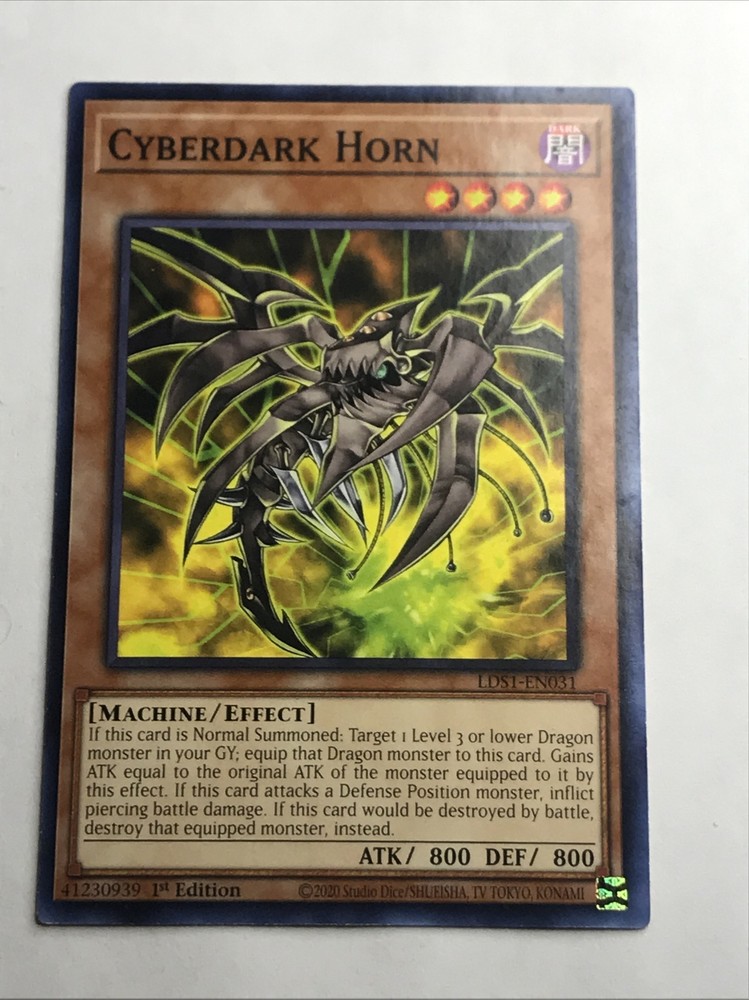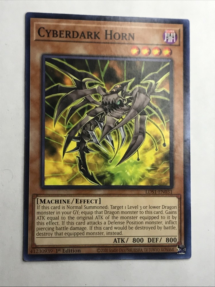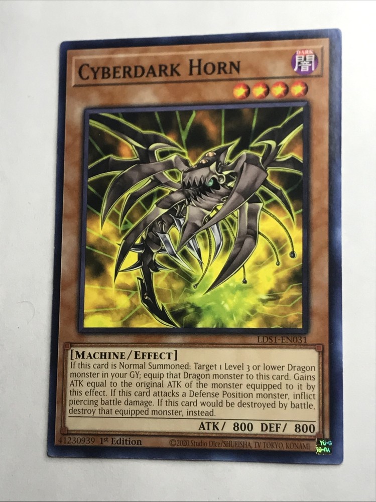 The product is a collectible card from the YUGIOH game set "Legendary Duelists: Season 1" released in 2020. The card features the character "Cyberdark Horn" and is specifically named "Cyberdark Horn." Its card number is "LDS1-EN031" and it is part of the Collectible Card Game category. This card is likely sought after by collectors and players looking to enhance their YUGIOH card collection or build specific decks centered around the Cyberdark Horn character.