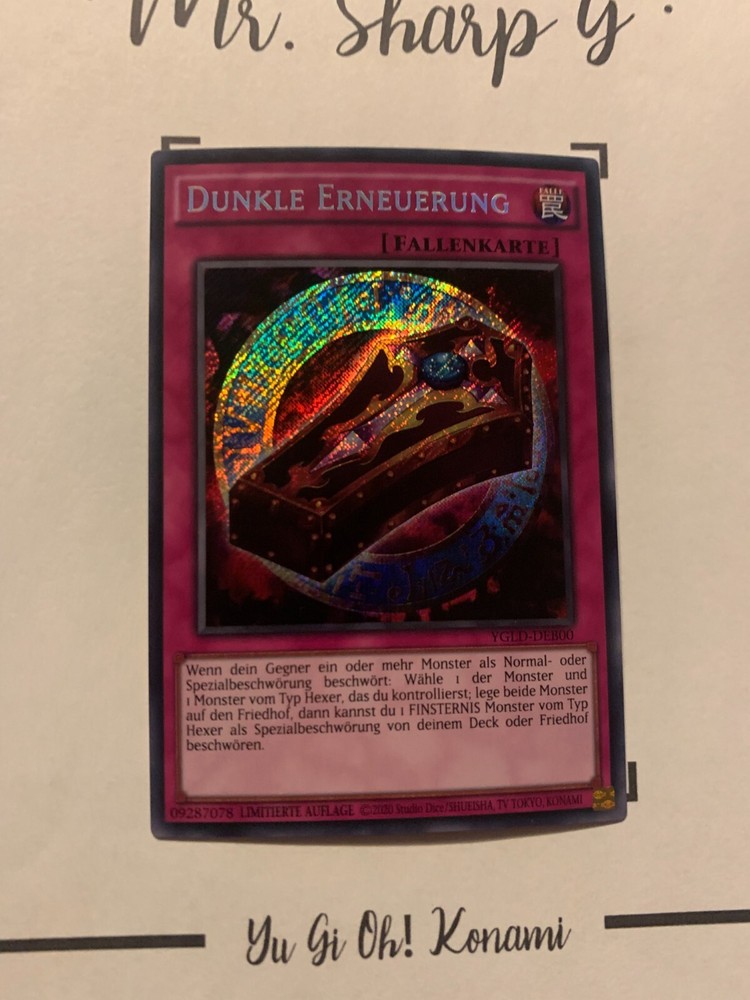 - Mr. Sharp G - - Online Store - TRADING CARDS-TCG-COLLECTION-SETS-TOURNAMENT-Yu Gi Oh! Konami * * * DUNKLE ERNEUERUNG - LIMITIERTE AUFLAGE YGLD-DEB00 - Bitte schauen Sie sich die beigefügten Bilder an, um einen vollständigen Überblick über den Zustand jedes Artikels zu erhalten. - Zustand des Artikels: Neu* - in einem neuwertigem Zustand. (* Neuer Zustand - kann aber leichte Mängel wie 'whitening', leichte Eindrücke, Dellen u.a. haben - die von der Herstellung der Karte aus Produktion stammen, bitte den Bildern und in der Beschreibung den Zustand entgegennehmen) - Typ/ Serie: FALLENKARTE / LIMITIERTE AUFALGE YGLD-DEB00 - Seltenheitsstufe/ Rarity: SECRET RARE - Edition : YUGI'S LEGENDARY DECKS / 2015 / GERMAN * * * + Kartenschutzhülle & Toploader inklusiver im Preis + mehrfache Bestellung = einmalige Versandkosten + versicherter Versand Bestellung in Höhe - v. 8,50EUR in Deutschland/ Inland - v. 12,50EUR im Ausland/ International + Großbestellungen kostenloser Versand Inland und International - Bei Fragen, Details, nicht im Bestand gewünschte Karten/ Artikel oder Versandgutschriften schreiben Sie uns! Wir freuen uns auf Ihre Nachricht! - Vielen Dank für Ihr Vertrauen, Unterstützung und Besuch in unserem Store ! - Ihr Mr. Sharp G Team