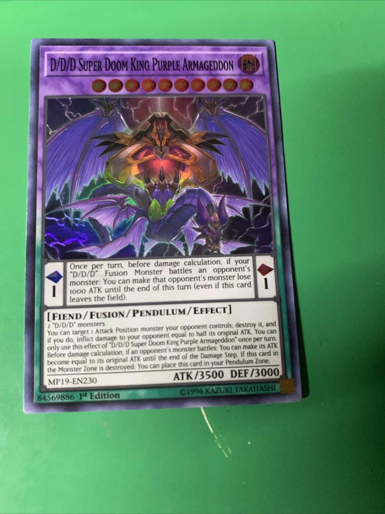 This highly sought-after card is a must-have for any Yu-Gi-Oh! TCG collector. The D/D/D Super Doom King Purple Armageddon card, with its Super Rare rarity, is the highlight of the 2019 Gold Sarcophagus Tin Mega Pack. The card is in English language and has a card number of MP19-EN230. With an Attack/Power of 3500 and Defense/Toughness of 3500, this Effect card is manufactured by Konami and is part of the Collectible Card Games category, under the Toys & Hobbies section. The card features 1st Edition and is ideal for those looking to complete their collection. Get your hands on this card today and add it to your Yu-Gi-Oh! TCG collection.