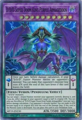 You are bidding on : 1 x Yu-Gi-Oh Mega Pack 2019 D/D/D Super Doom King Purple Armageddon (Super Rare - 1st Edition) MP19-EN230 All cards are in Near Mint condition unless specified Pictures are stock pictures ONLY it is not of the actual card How we identify the condition of the card: Near Mint: Most of the time cards in this condition are pack fresh but, the card may have minor flaws that are not visible with a quick inspection, small white dots or scratches that you have to closely examine the card to see. Excellent: Overall the card looks near mint but may have minor scratches, slightly worn edges that are visible but they do not interfere with the way the card looks. Lightly Played: Similar to a card in excellent condition except there is more whitening around the edges and the corners are a little more worn or slight bends or creases that are visible. There might be some slight whitening on the back or front of the card. Imperfections will be visible with a quick inspection. When the card is sleeved the imperfections will not be noticeable and the card will look just like the rest of your cards Played: There is a large amount of whitening around the edges and the corners have a good amount of damage, many scratches, bends and/or creases on the card. When the card is sleeved it can still be played Shipping and Handling : Canada Shipping is $1.75 CAD Tracking is offered for $13 CAD BUT tracking is required on any purchases that are over $50 CAD Please contact us for combined shipping if interested in purchasing multiple cards before paying USA Shipping is $2.50 CAD Regular Mail for all orders under $19.99 Shipping is $7.99 CAD with tracking for all orders $19.99 and over Please contact us for combined shipping if interested in purchasing multiple cards before paying INTERNATIONAL Shipping is $5.99 CAD with regular mail Tracking is offered for $29.99 CAD BUT tracking is required for purchases over $50 CAD Please contact us for combined shipping if interested in purchasing multiple cards before you pay Combined shipping: We offer combined shipping: each and every additional item after the first one is only $0.25 (25 cents). To obtain combined shipping fees, please use the shopping cart or ask for the combined shipping invoice BEFORE you pay. If you pay item-by-item, right away after the purchase, we will not be able to offer you combined shipping anymore. Handling Your order will be shipped 1-3 business days after payment has been received *“Business days” are normal weekdays. Saturdays, Sundays, and major holidays do not count as business days. Cards purchased are packaged and shipped in a sleeve, toploaders, a team bag and an envelope to ensure protection of cards Payment : We accept payment via PayPal only. Payments should be made within 5 days after purchase Epic Cards and Games Any questions feel free to email us and allow 1 day for a response. Thanks for looking! Sales Tax (Canada Only) : Purchases made by Canadian residents are subject to applicable GST/HST, depending on your province/territory. (If you do not agree to this, please do not bid. We have a registered business in Canada and are required by law to charge taxes to anything shipped within the country.) Thank you for shopping with Epic Cards and Games