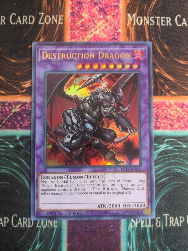 You are bidding on : 1 x Yu-Gi-Oh Legendary Collection Kaiba DESTRUCTION DRAGON (Ultra Rare - Limited Edition) LC06-EN003 All cards are in Near Mint condition unless specified Pictures are stock pictures ONLY it is not of the actual card How we identify the condition of the card: Near Mint: Most of the time cards in this condition are pack fresh but, the card may have minor flaws that are not visible with a quick inspection, small white dots or scratches that you have to closely examine the card to see. Excellent: Overall the card looks near mint but may have minor scratches, slightly worn edges that are visible but they do not interfere with the way the card looks. Lightly Played: Similar to a card in excellent condition except there is more whitening around the edges and the corners are a little more worn or slight bends or creases that are visible. There might be some slight whitening on the back or front of the card. Imperfections will be visible with a quick inspection. When the card is sleeved the imperfections will not be noticeable and the card will look just like the rest of your cards Played: There is a large amount of whitening around the edges and the corners have a good amount of damage, many scratches, bends and/or creases on the card. When the card is sleeved it can still be played Shipping and Handling : Canada Shipping is $1.99 CAD Tracking is offered for $9.99 CAD BUT tracking is required on any purchases that are over $50 CAD Please contact us for combined shipping if interested in purchasing multiple cards before paying USA Shipping is $2.99 CAD Regular Mail for all orders under $19.99 Shipping is $7.99 CAD with tracking for all orders $19.99 and over Please contact us for combined shipping if interested in purchasing multiple cards before paying INTERNATIONAL Shipping is $5.99 CAD with regular mail Tracking is offered for $29.99 CAD BUT tracking is required for purchases over $50 CAD Please contact us for combined shipping if interested in purchasing multiple cards before you pay Combined shipping: We offer combined shipping: each and every additional item after the first one is only $0.25 (25 cents). To obtain combined shipping fees, please use the shopping cart or ask for the combined shipping invoice BEFORE you pay. If you pay item-by-item, right away after the purchase, we will not be able to offer you combined shipping anymore. Handling Your order will be shipped 1-3 business days after payment has been received *“Business days” are normal weekdays. Saturdays, Sundays, and major holidays do not count as business days. Cards purchased are packaged and shipped in a sleeve, toploaders, a team bag and an envelope to ensure protection of cards Payment : Payments should be made within 5 days after purchase Epic Cards and Games Any questions feel free to email us and allow 1 day for a response. Thanks for looking! Sales Tax (Canada Only) : Purchases made by Canadian residents are subject to applicable GST/HST, depending on your province/territory. (If you do not agree to this, please do not bid. We have a registered business in Canada and are required by law to charge taxes to anything shipped within the country.) Thank you for shopping with Epic Cards and Games
