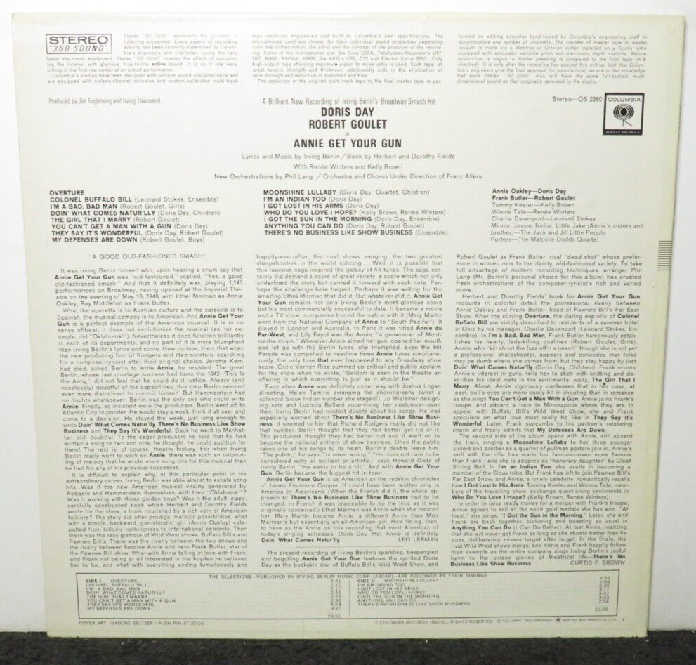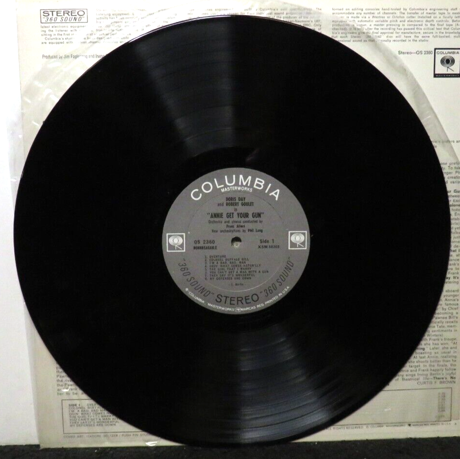 YOU ARE BIDDING ON A DORIS DAY ANNIE GET YOUR GUN SOUNDTRACK (VG+) OS-2360 LP VINYL RECORD RECORDS ARE IN VERY GOOD USED CONDITION UNLESS NOTED COVERS USUALLY HAVE WEAR AND ARE NOT GRADED PLEASE VIEW ALL PHOTOS FOR THE BEST DESCRIPTION I WILL COMBINE SHIPPING ON RECORDS BOUGHT IN THE SAME 5 DAY PERIOD EACH ADDITIONAL RECORD IS 50 CENTS MORE PLEASE REQUEST TOTAL BEFORE PAYING TO GET DISCOUNT I USE RECORD MAILERS WITH CARDBOARD BACKERS HERE IS THE GRADING THAT I USE FOR REFERENCE TO MY VISUAL INSPECTION IF THERE IS A PROBLEM PLEASE LET ME KNOW I STRIVE FOR 5 STAR FEEDBACK Near Mint (NM or M-) A nearly perfect record. Many dealers won't give a grade higher than this implying (perhaps correctly)that no record is ever truly perfect. The record should show no obvious signs of wear. A 45 RPM or EP sleeve should have no more than the most minor defects, such as almost invisible ring wear or other signs of slight handling. Basically, an LP in near mint condition looks as if you just got it home from a new record store and removed the shrink wrap. Near Mint is the highest price listed in all Goldmine price guides. Anything that exceeds this grade, in the opinion of both buyer and seller, is worth significantly more than the highest Goldmine book value. Very Good Plus (VG+) A Very Good Plus record will show some signs that it was played and otherwise handled by a previous owner who took good care of it. Record surfaces may show some signs of wear and may have slight scuffs or very light scratches that don't affect one's listening experiences. Slight warps that do not affect the sound are "OK". The label may have some ring wear or discoloration, but it should be barely noticeable. The center hole will not have been misshapen by repeated play. In general, if not for a couple things wrong with it, this would be Near Mint. All but the most mint-crazy collectors will find a Very Good Plus record highly acceptable. Very Good (VG) Many of the defects found in a VG+ record will be more pronounced in a VG disc. Surface noise will be evident upon playing, especially in soft passages and during a song's intro and fade, but will not overpower the music otherwise. Groove wear will start to be noticeable, as with light scratches (deep enough to feel with a fingernail) that will affect the sound. Labels may be marred by writing, or have tape or stickers (or their residue) attached. Good (G), Good Plus (G+) Good does not mean Bad! A record in Good or Good Plus condition can be put onto a turntable and will play through without skipping. But it will have significant surface noise and scratches and visible groove wear (on a styrene record, the groove will be starting to turn white).