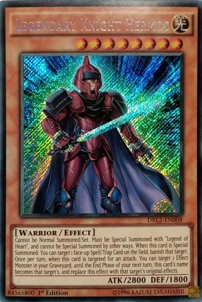 DRL2-EN008 LEGENDARY KNIGHT HERMOS SECRET RARE 1ST EDITION ALL YU-GI-OH CARDS I SELL ARE KONAMI TOURNAMENT LEGAL. CARDS ARE ALL NEAR MINT TO LIGHTLY PLAYED CONDITION. POSTAGE IS FREE SO YOU CAN BUY AS MANY CARDS AS YOU WANT FROM US AND NOT PAY A PENNY POSTAGE. IF YOU HAVE ANY QUESTIONS PLEASE FEEL FREE TO CONTACT ME. Track Page Views With Auctiva's FREE Counter