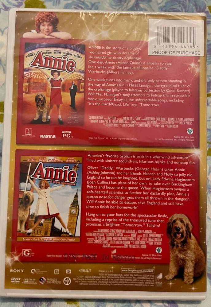 BRAND NEW DVD : TITLE : Annie Double Feature- Annie/ Annie A Royal Adventure YEAR : 2014 COMPANY : Sony RATING : PG/G LENGTH: Approximately 127/92 Minutes LANGUAGE: English SUBTITLES : CC DESCRIPTIONS: MISC INFO : Region 1, BRAND NEW STILL SEALED- Item May have a former price sticker or upc sticker (or some sticker residue) on outer cover Media Mail in the continental United States, Media Mail normally takes an average of 2-9 business days for delivery but can take upwards to 30 days for delivery, it is not a quick delivery option, if you are interested in Priority shipping or other options, please contact about changing shipping options.