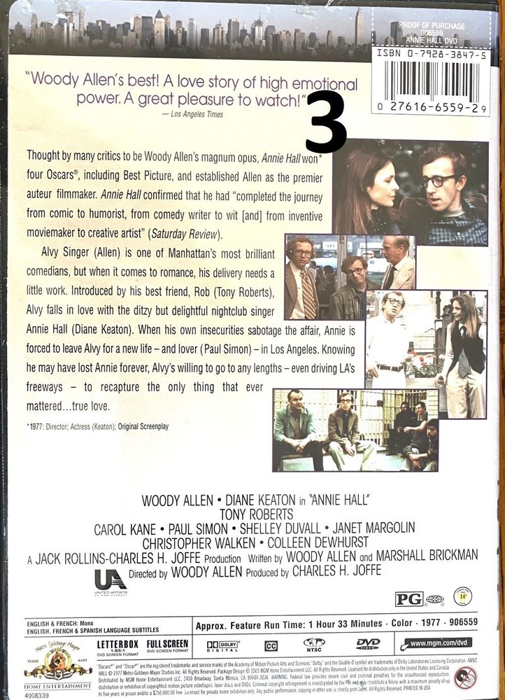 Annie Hall English; French /Subtitles: English; French; Spanish Any additional DVD (100 listed) ship free, Save $6.00 For а list of all DVDs see specially created eBay listing called: DVD #k#7#w All DVD in single quantity How to order: 1. Select the DVDs you like. (From all the listed DVD on my account) Do not purchase DVDs separately as eBay charges a shipping fee for each order. 2. Send an email with the list of selected DVDs. Example: 7; 65; 95; 7m; 12m etc. 3. We will send an eBay invoice . Same or next day shipment from Nevada