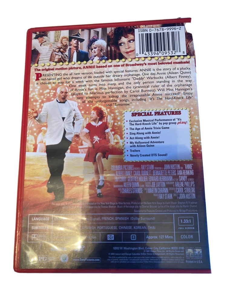 Description: DVD: Annie, Special 20th anniversary edition with special features Other Details: Fast Shipping within the USA. (We offer international shipping via Ebay's Global Shipping Program (GSP), Please inquire with eBay about cost & availability). PAYMENTS: We accept Paypal and ebay payments. SHIPPING TIME: We ship all items within 2 business days of your payment clearing (Excluding holidays and Weekends). RETURNS: We accept ANY item back, unless listed AS/IS, within 30 days of the original purchase date for a full refund. All returns must come back in the same condition they were shipped out and arrived in. ALL ITEMS are stored in NON-SMOKING environment. FEEDBACK: We aim to earn positive 5 star feedback for every item. If your happy with your purchase, please take a minute to leave positive 5 star feedback. If you have any issues with your purchase, please contact us directly using eBays message service to resolve the issue so that we can earn your positive 5 star feedback.