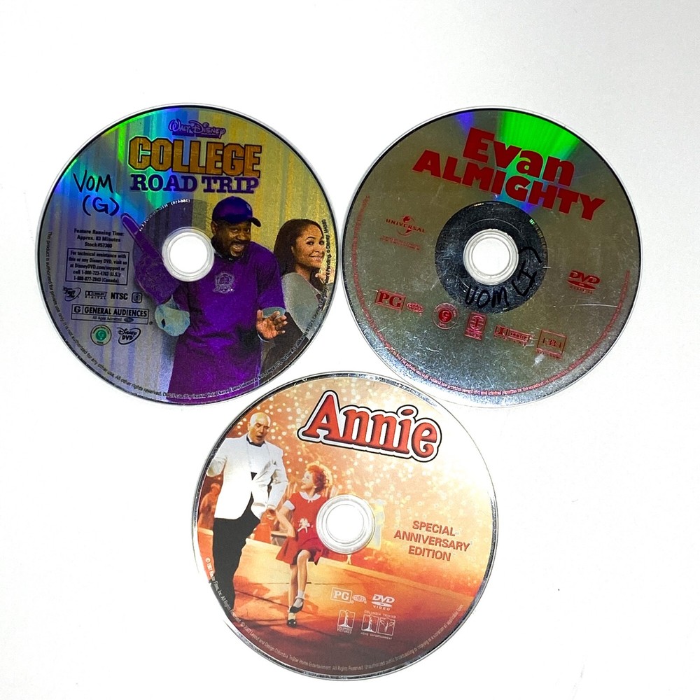 DVD Bundle (3) Annie - Special Edition, Evan Almighty, College Road Trip Disney Bundle features a mixture of adventure, comedy, and musical genres suitable for the whole family. It is a perfect gift for any movie lover, and you are guaranteed to have an exciting and entertaining time watching these classic movies. Bundle of 3 DVD movies from the early-mid 2000s Musical & comedy 1) Annie: Special Anniversary Edition, PG, 2003 2) Evan Almighty, PG, 2007 Steve Carell, Morgan Freeman 3) College Road Trip (Walt Disney), G, 2008 Martin Lawrence, Raven Symone Good used condition. All DVDS tested & working. No cases included - DVDs in slips. Please check out our store as we are daily adding new items! SHIPPING: We will be happy to combine shipping and give you a discount if you purchase multiple items at a time. For combined shipping simply select your items and ask to be invoiced prior to paying and we will invoice you with a shipping discount.