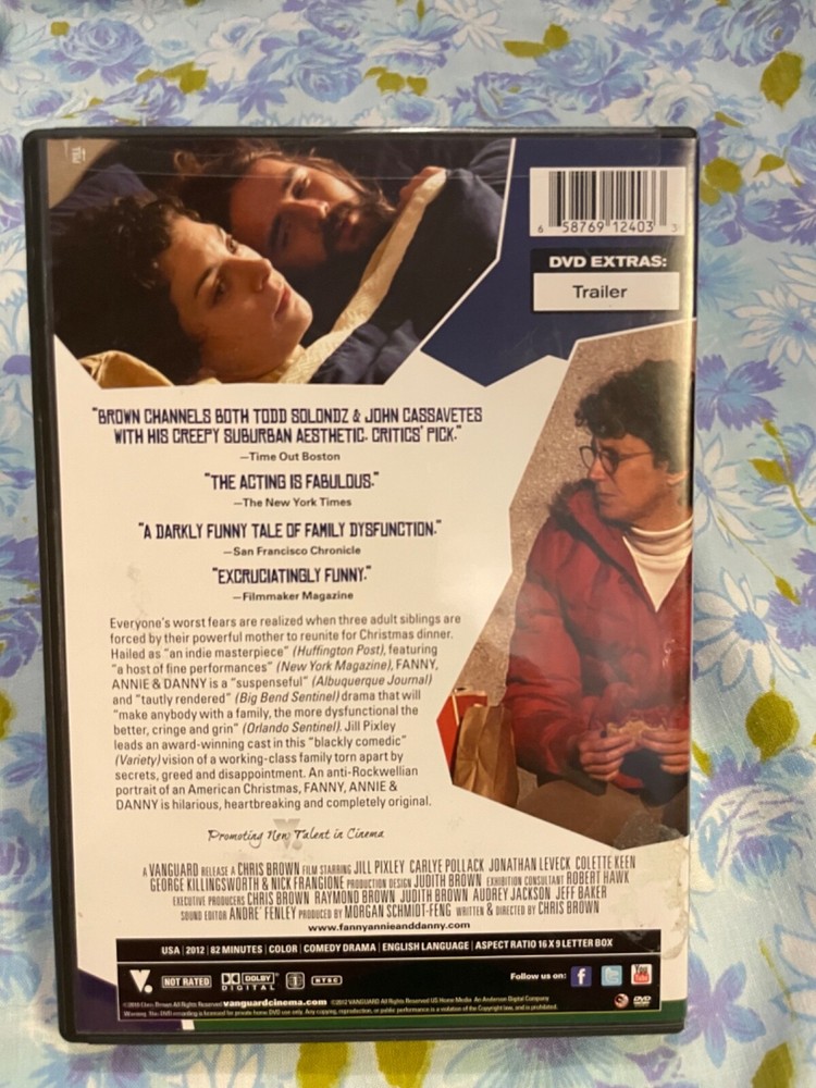 Very good gently used DVD : TITLE : Fanny, Annie, & Danny ( A film by Chris Brown) YEAR : 2012 RATING : Not rated COMPANY : Vanguard LENGTH: approximately 82 minutes LANGUAGE: English SUBTITLES: DESCRIPTIONS: "Everyone's worst fears are realized when three adult siblings are forced by their powerful mother to reunite for Christmas dinner. Hailed as 'an indie masterpiece (Huffington post) featuring 'a host of fine performances' (new York magazine) Fanny, Annie, & Danny is a "suspenseful" (Alburguerque Journal) and "tautly rendered' (Big Bend Sentinel) Drama that will "Make anybody with a family, the more dysfunctional the better, cringe and grin." (Orlando Sentinel).... An Anti-Rockwellian portrait of an American Christmas, FANNY, ANNIE & DANNY is hilarious, heartbreaking, and completely original." MISC INFO : Region 1, very good gently used condition, former price sticker residue on back cover Media Mail in the continental United States, Media Mail normally takes an average of 2-9 business days for delivery but can take upwards to 30 days for delivery, it is not a quick delivery option, if you are interested in Priority shipping or other options, please contact about changing shipping options.
