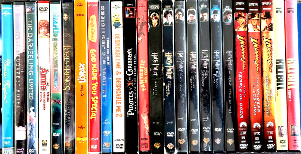 DVD Movie Lot Pick & Choose Your Movie Titles & Bundle them in Your Cart! Kill Bill Vol. 1, Kill Bill Vol. 2, Pirates Of The Caribbean, Indiana Jones Raiders of the Lost Ark, Indiana Jones Temple of Doom, Indiana Jones The Last Crusade, Harry Potter The Sorcerer's Stone, Harry Potter The Chamber of Secrets, Harry Potter The Prisoner of Azkaban, Harry Potter The Order of the Phoenix, Harry Potter The Goblet of Fire, Harry Potter The Half-Blood Prince, Harry Potter The Deathly Hallows Part 1, Fantastic Mr. Fox, Dr.Seuss' The Lorax, Annie (1982 Film), Lord Of The Rings The Return of the King, Charlie and the Chocolate Factory Johnny Depp 2005, Despicable Me & Despicable Me2... 2 Movies, VeggieTales "God Made You Special", La Ligue Des Justiciers. Justice League in French, Moonrise Kingdom, The Grand Budapest Hotel, The Darjeeling Limited, Trainspotting (2-Disk Set), Mean Streets, Stanley Kubrick's Barry Lyndon, Brick, Superman Returns, Fight Club (2-Disk's). Dillinger, Cool Britannia, Little Britain Second Series, Little Brittain Third Series,...