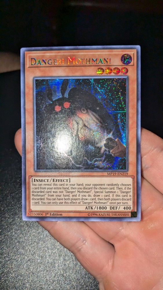 Elevate your Yu-Gi-Oh! TCG collection with the enigmatic "Danger! Mothman!" card, an essential from the 2019 Gold Sarcophagus Tin Mega Pack. This card, numbered MP19-EN219, boasts a striking Prismatic Secret Rare rarity that stands out with its unique holographic design, ensuring it's a centerpiece in any duel or display. Manufactured by Konami and presented in English, "Danger! Mothman!" features an impressive attack power of 1800 and a defense toughness of 400, ready to take on any challenger. As a 1st Edition release, it holds a special place for collectors and players alike, commemorating its debut in the 2019 series.