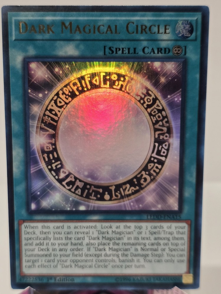 The Dark Magical Circle LEDD-ENA15 card from the Legendary Dragon Decks set is a highly sought-after ultra rare collectible card in the Yu-Gi-Oh! TCG. Manufactured by Konami, this 1st edition spell card features a unique attribute that allows players to summon multiple "Dark Magician" cards from their deck and banish their opponent's cards. This card, when activated, offers players a strategic advantage by providing additional options and control over the game. With its English language text and special features, the Dark Magical Circle is a valuable addition to any Yu-Gi-Oh! card collection.