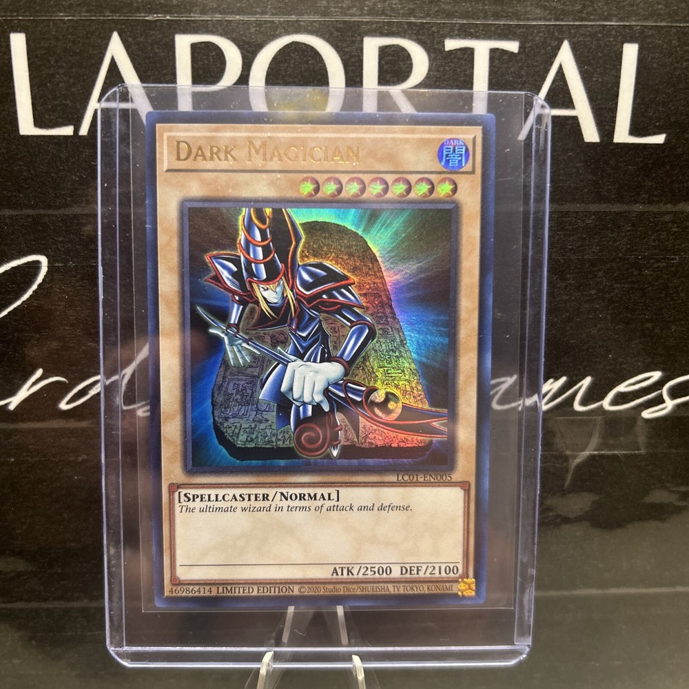 The Dark Magician card from the Legendary Collection: 25th Anniversary Edition is an Ultra Rare, Limited Edition card with a dark attribute. It has a defense/toughness of 2100 and an attack/power of 2500. This Yu-Gi-Oh! TCG card is a Normal type Spellcaster card with the card number LC01-EN005. It is manufactured by Konami and comes in English language.