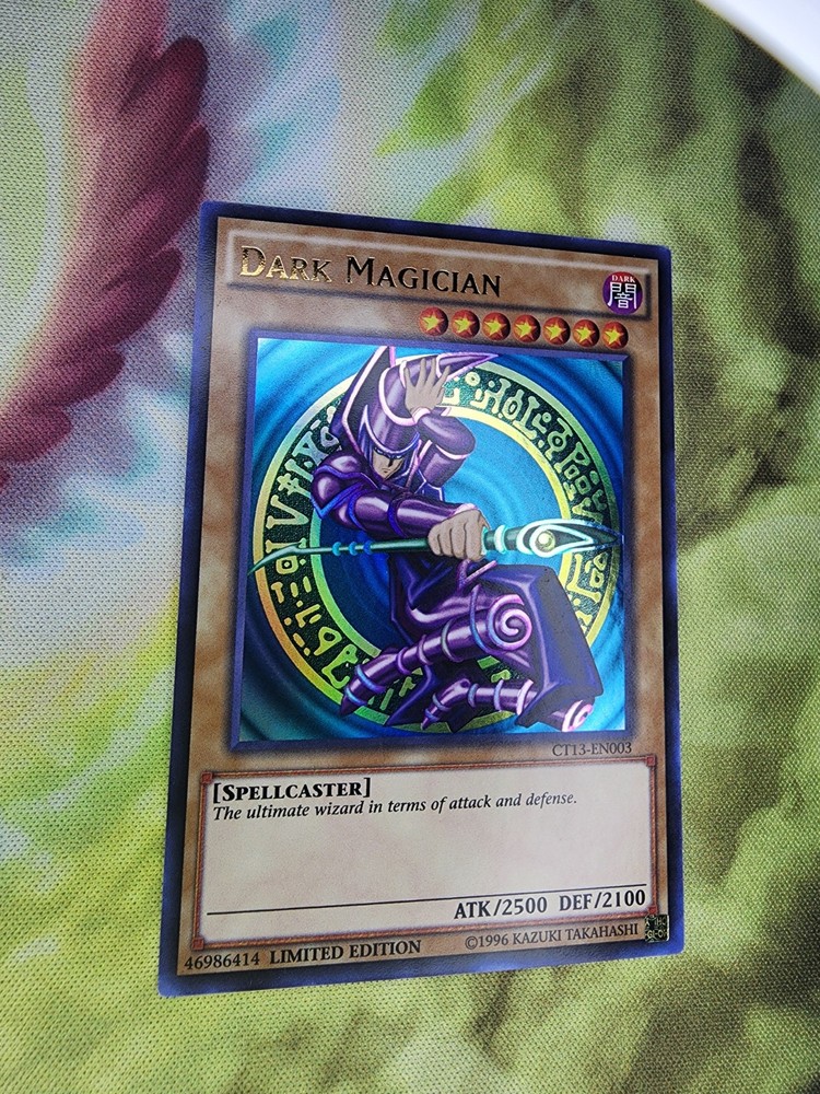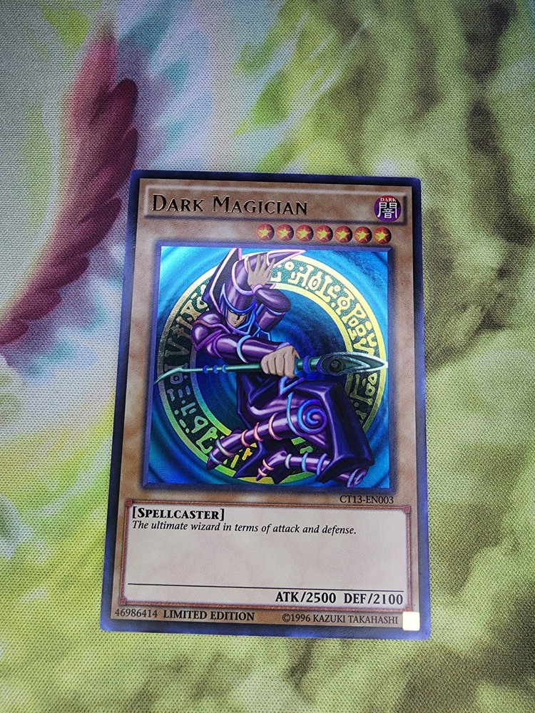Dark Magician CT13-EN003 from the 2016 Mega-Tins is a Limited Edition Ultra Rare Yu-Gi-Oh! TCG card. This Spellcaster creature has an impressive 2500 Attack and 2100 Defense, making it the ultimate wizard in terms of attack and defense. It is part of the Attribute Dark and is in English language.