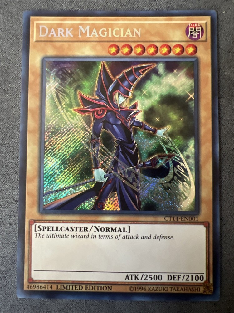 The Dark Magician CT14-EN001 2017 Mega-Tins Limited Edition card is a highly sought-after collectible in the Yu-Gi-Oh! TCG world. With a high defense and attack power of 2100 and 2500 respectively, this Secret Rare card features the iconic Spellcaster attribute. Manufactured by Konami, this English card is part of the 2017 Mega-Tins set and is considered near mint or better condition. Perfect for collectors and players alike, this limited edition Dark Magician card is a valuable addition to any card collection.