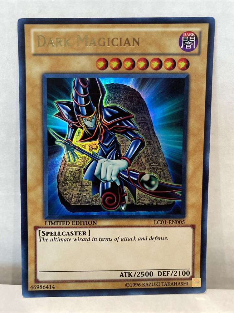 This is a limited edition Dark Magician card from the Yu-Gi-Oh Legendary Collection 1. The card features a Spellcaster creature type with 2100 defense and 2500 attack. It belongs to the ultra-rare category and has the card number LC01-EN005. The card is in English language and manufactured by Konami. This card is perfect for collectors and players of the Yu-Gi-Oh! TCG game. The card's dark attribute adds to its unique charm and makes it a must-have for any collector. Get your hands on this card now and add it to your collection!