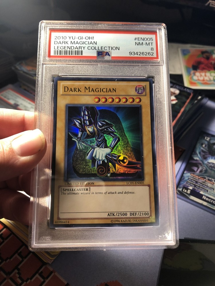 Unleash the power of magic with the iconic Dark Magician card from the Legendary Collection: 25th Anniversary Edition. As a staple for any Yu-Gi-Oh! TCG player, this Ultra Rare card boasts an impressive 2500 attack power and 2100 defense toughness, ensuring it can take on any challenger in your deck. The Limited Edition Dark Magician, card number LC01-EN005, features a captivating Holo finish that sets it apart in both appearance and play. Crafted by Konami and presented in English, this Spellcaster-type card aligns with the Dark attribute, adding a sinister edge to your strategic arsenal. The standard-sized card, manufactured in 2010, is not autographed, maintaining its classic charm. Whether for competitive play or as a treasured piece of Yu-Gi-Oh! history, the Dark Magician card is an essential addition to any collection. Slab comes in a prefect fit sleeve and will be type up between two pieces of carboard for extra protection and sent in a bubble mailer. Customer will pay for USPS ground advantage so that way a tracking is available I will send out within 1 to 2 businesses days