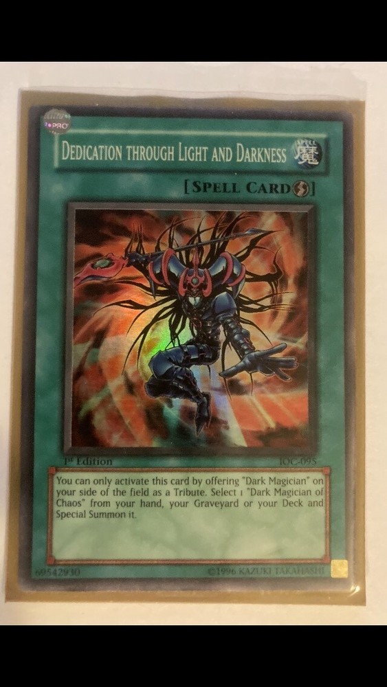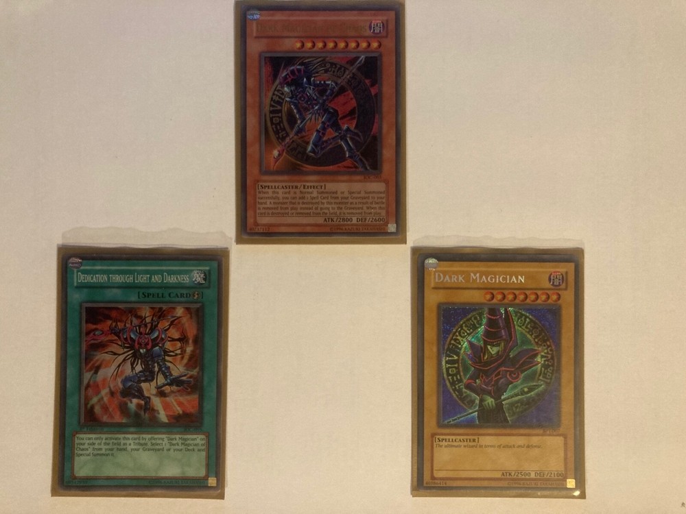 Dark Magician of Chaos, Dark Magician, Dedication Through Light & Darkness 1st edition These cards have been stored away for 16 years. I am the only owner. Good times dueling years ago....