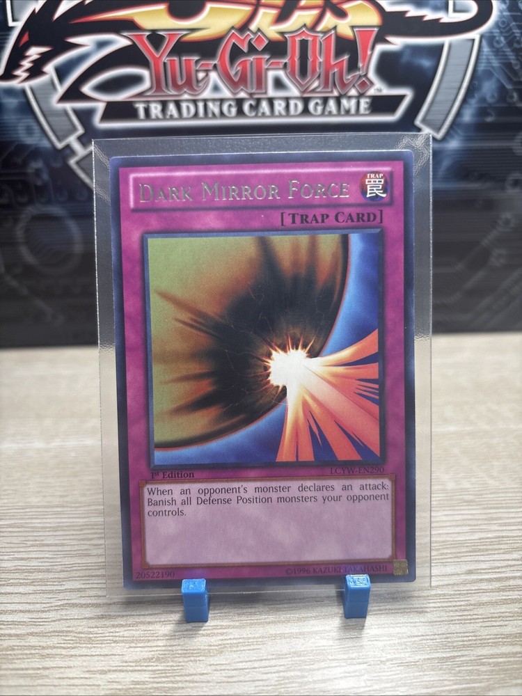 This is a rare and highly sought-after card from the Yu-Gi-Oh! TCG. The Dark Mirror Force card is a Trap-Normal type card with an Attack/Power of 0 and Defense/Toughness of 0. It belongs to the Legendary Collection 3: Yugi's World set and has a card number of LCYW-EN290. This card is in English language and is a 1st Edition manufactured by Konami. It is perfect for collectors and players alike, and is sure to be a valuable addition to any collection. The card features a unique design and is ideal for those who enjoy playing trap cards. Get your hands on this rare card today and add it to your collection!