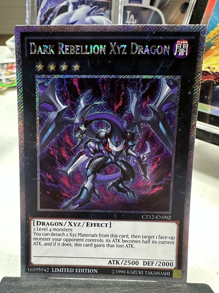 The Dark Rebellion Xyz Dragon CT12-EN002 from the 2015 Mega-Tins Limited Edition is a highly sought-after collectible card in the Yu-Gi-Oh! TCG. This Secret Rare card features a Dark attribute Dragon creature with 2000 Defense and 2500 Attack power. Manufactured by Konami, the English-language card adds an Xyz and Effect element to any deck. The holo finish adds a premium touch to this rare and limited edition card.