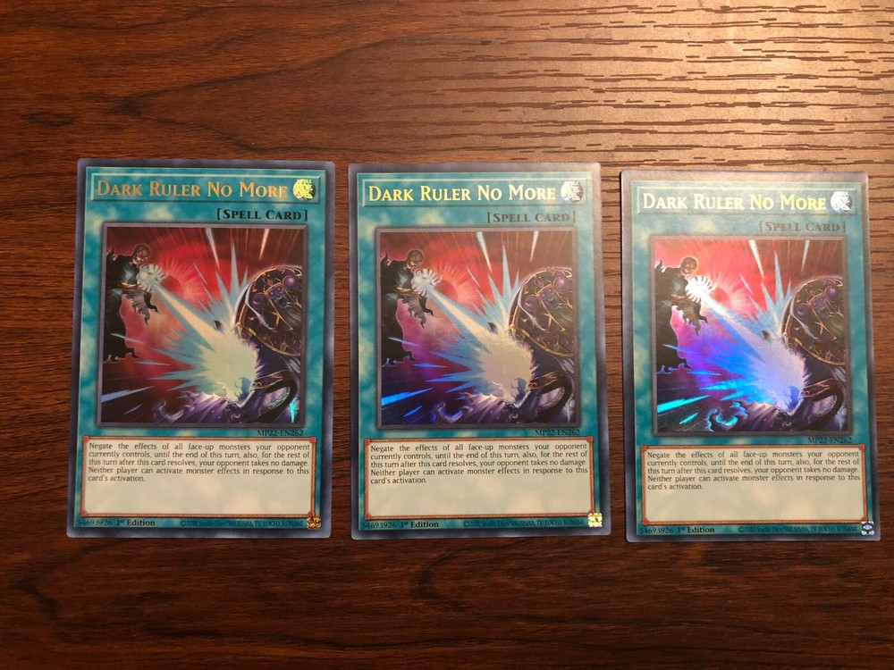 You will be buying a Playset (3 cards) of Mint/Near Mint 1st Edition Ultra Rare, Dark Ruler No More from 2022 Tin of Pharaoh's Gods (MP22-262) Yugioh Cards. These cards have never been played. Ships with tracking. Please feel free to take a look at my other listings. Thanks!
