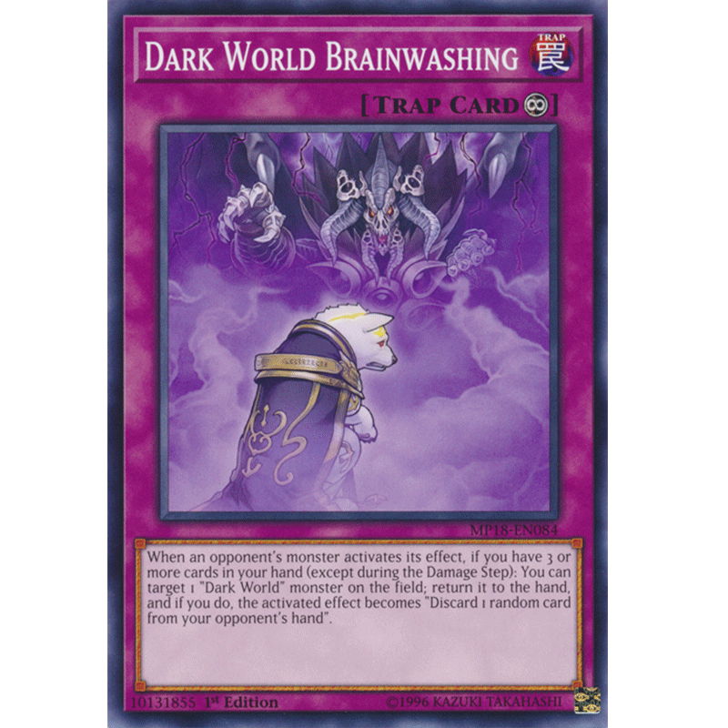 | Card Text | When an opponent's monster activates its effect, if you have 3 or more cards in your hand (except during the Damage Step): You can target 1 "Dark World" monster on the field; return it to the hand, and if you do, the activated effect becomes "Discard 1 random card from your opponent's hand". |