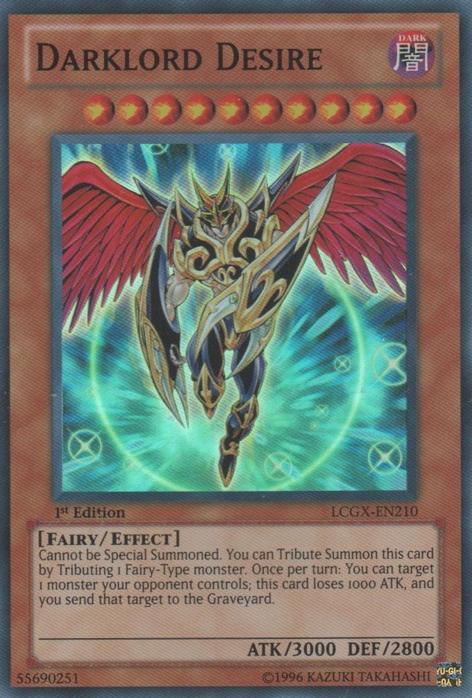 Darklord Desire - LCGX-EN210 - Super Rare - 1st Edition Image is a stock photo of the card. You will receive the card in Moderately Played condition Condition: Moderately Played ATK/DEF : 3000/2800 Attribute : Dark Card Number : LCGX-EN210 Card Rules : Card Text : This card cannot be Special Summoned. This card can be Tribute Summoned by Tributing 1 Fairy-Type monster. Once per turn, during your Main Phase, you can have this card lose 1000 ATK, and send 1 monster your opponent controls to the Graveyard. Card Type : Effect Monster Edition : 1st Level : 10 Monster Type : Fairy Name : Darklord Desire Passcode : 55690251 Rarity : Super Rare Set : Legendary Collection 2 Be sure to visit our store for a wide selection of your favorite cards! We are running specials RIGHT NOW!! Shipping Options: ~Ships in a regular white envelope with a stamp for FREE! (THERE IS NO TRACKING INFORMATION AVAILABLE FOR THE ABOVE METHOD. SHIPPING TIME IS 4-10 BUSINESS DAYS) ~Ships in a TRACKEDbubble mailer for $5.99! ~Shipments are handled same or next business day. ~FREE SHIPPING for each additional card, so shop around our store!