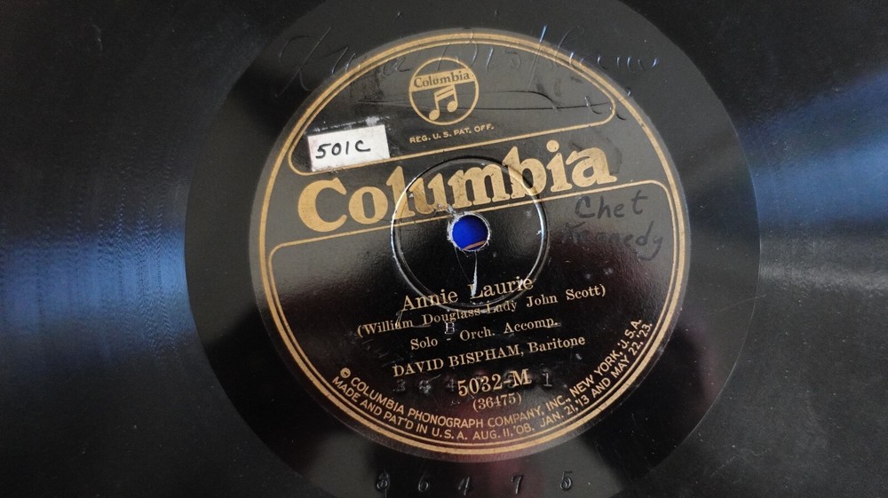 David Bispham "Annie Laurie/Arrow and Song" Columbia 5032-M 12" 78 V+ on record some marks and scuffs, plays good. grading/Condition The VJM Record Grading System. N (78) M (LP). As new and unplayed (there are virtually no 78s that can categorically be claimed to be unplayed). N- (78) M- (LP). Nearly Mint, but has been played. No visible signs of wear or damage. E+ (78) VG+ (LP). Plays like new, with very, very few signs of handling, such as tiny scuffs from being slipped in and out of jackets. E (78) VG (LP). Still very shiny, near new looking, with no visible signs of wear, but a few inaudible scuffs and scratches. E- (78) VG- (LP). Still shiny but without the lustre of a new record, few light scratches. LP: Some wear, scratches and scuffs, but no skipped or repeat grooves. V+ (78) G+ LP. V+ is an average condition 78 in which scuffs and general use has dulled the finish somewhat. Wear is moderate but playing is generally free from distortion. Surface noise not overly pronounced. LP: Below average with scuffs and scratches on fewer than half the tracks. No skips or repeat grooves. V (78) G (LP). Moderate, even wear throughout, but still very playable. Surface noise and scratches audible but not intrusive. V- (78) G- (LP). Quite playable still, but distortion and heavy greying in loud passages. Music remains loud in most passages. Surface noise and scratches well below music level. LP: Lowest Grade. Audible scratches, etc. on more than half the tracks. Listening uncomfortable. G+ (78). Grey throughout but still serviceable. Music begins to sound muffled. Heavy scratches. G (78). Quite seriously worn and scratched, but music level is still higher than surface noise. G- (78). Music still prominent, but wear and scatch damage extensive. F (78). Most of music remains audible over surface noise, but listening now uncomfortable. P (78). Unplayable.