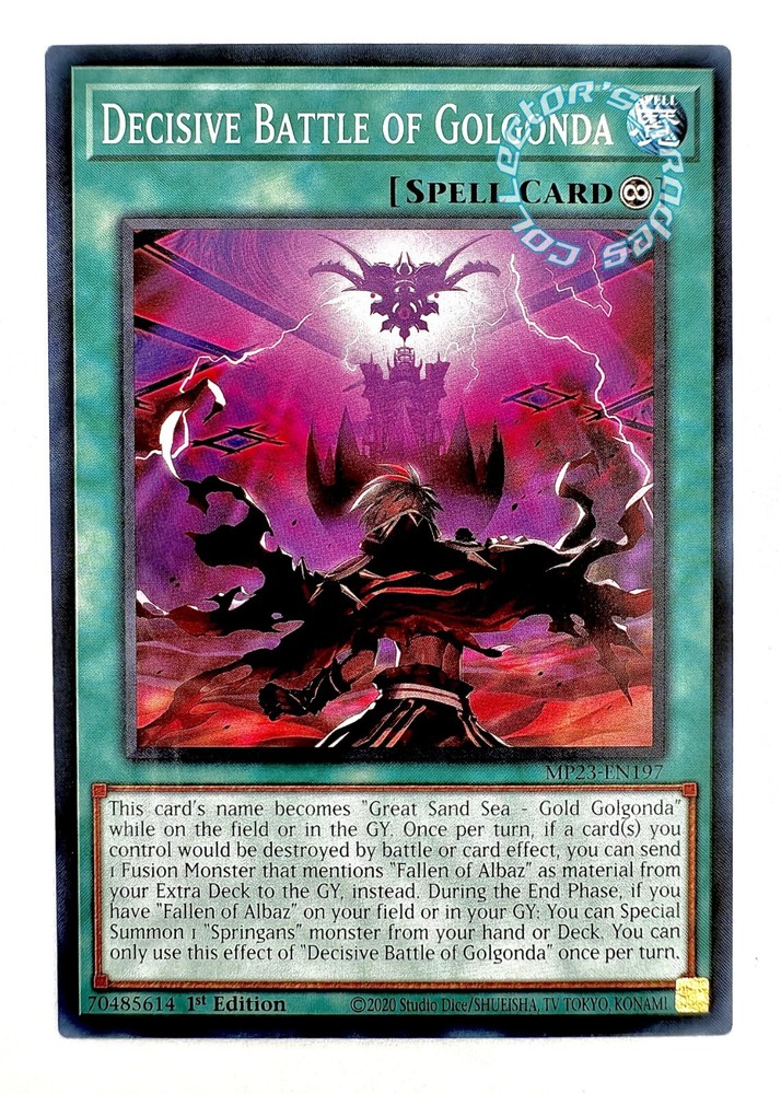 " Decisive Battle of Golgonda" MP23-EN197 Common Yu-Gi-Oh! 25th Anniversary Tin: Dueling Heroes Mega Pack Near Mint - "Decisive Battle of Golgonda " - - Spell Card (Continuous/Effect) - - No.197 - - Common - - 2023 Yu-Gi-Oh! - 25th Anniversary Tin: Dueling Heroes Mega Pack - - 1st Edition - - Continuous/Effect - - 100% Authentic Yu-Gi-Oh! - - Near Mint - - Disclaimer- No replacements can or will be shipped in case of missing/broken package. If you have any questions, comments, or concerns, please feel free to contact me. Thank you for your interest in our listings and store and please come again!