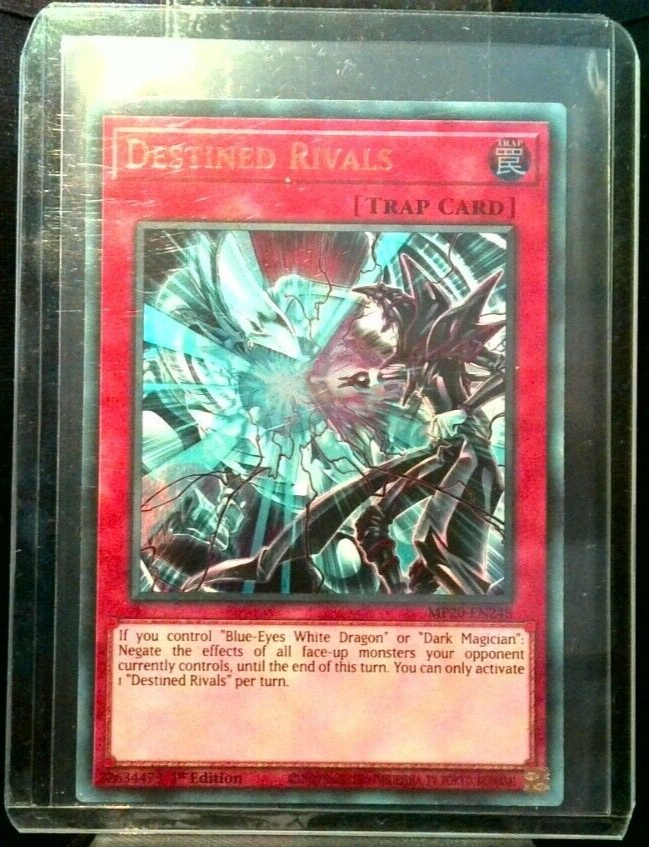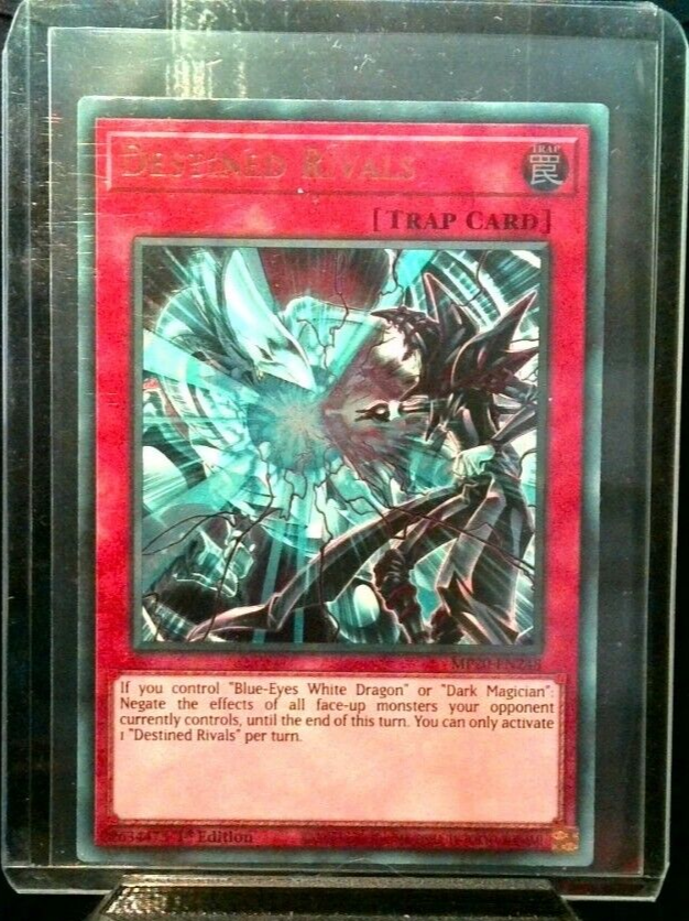 Destined Rivals - MP20-EN248 is an Ultra Rare 1st Edition Trap-Normal card from the Yu-Gi-Oh! TCG set 2020 Mega-Tin: Lost Memories. This Holo card features a dazzling finish, making it a must-have for collectors and players alike. In Mint/Near Mint condition, this card is a valuable addition to any Yu-Gi-Oh! card collection. Card Text: If you control "Blue-Eyes White Dragon" or "Dark Magician": Negate the effects of all face-up monsters your opponent currently controls, until the end of this turn. You can only activate 1 "Destined Rivals" per turn.