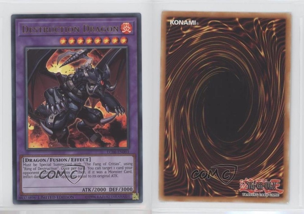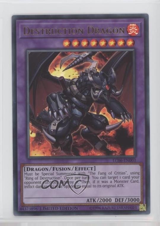 2018 Yu-Gi-Oh! - Legendary Collection Kaiba - [Base] - Limited Edition #LC06-EN003 Destruction Dragon (UR) COMC Item: 95060371 - YuGiOh Card Search for more: 2018 Yu-Gi-Oh! - Legendary Collection Kaiba Search for more: 2018 Yu-Gi-Oh! - Legendary Collection Kaiba - [Base] - Limited Edition View all of our Listings Auctions Buy It Now About Us Located in the beautiful Pacific Northwest, COMC (Check Out My Cards) is the world's largest consignment service for trading card singles. More than 10,000 people have used our consignment service to list over 50 million trading cards. Find out how we can help you consign your items on eBay by contacting us through eBay messaging. COMC -- "The Safe & Easy Way to Buy & Sell" Raw Condition for Modern Cards Unless otherwise noted, raw modern cards are listed in Near Mint-Mint condition or better. A NM-MT card appears to be Mint at first glance, but upon closer inspection, may exhibit some of the following: minor print defects (e.g. roller marks, print line, dimple), minor scratches, slight edge wear, and slight corner wear. Centering is clearly visible in the images provided and does not factor into our condition assessment. Raw Condition for Vintage Cards Unless otherwise noted, raw vintage cards are listed in Excellent condition or better. An EX card may exhibit some of the following: minor rounding of corners, surface wear, print defects, light scratches, and slight edge wear/chipping. Centering is clearly visible in the images provided and does not factor into our condition assessment. Domestic Shipping Combined shipping for multiple items is available. To receive combined shipping, please ensure all desired items are in your eBay shopping cart before proceeding to checkout. eBay limits orders to 40 items per order. We automatically combine multiple orders placed on the same day. If you place multiple orders on the same day, please contact us to request a refund of applicable shipping costs. Signature confirmation may be required on invoices over $400. All cards are protected and shipped securely. International Shipping COMC offers eBay's International Shipping (EIS) for international orders under $2,500* (see country exceptions below). All duties and import fees are paid at checkout; in the rare event that there are additional import fees upon delivery, these are borne by the buyer. EIS packages route through a shipping hub in Erlanger, KY before shipping to their final destination. Please note that EIS does not allow for combined shipments. The shipping rates are determined by eBay and cannot be adjusted. *Maximum sale price exceptions: Colombia, Kuwait ($2,000); Taiwan ($1,539); Chile, Costa Rica, Guatemala, Honduras, Trinidad and Tobago ($1,000); Antigua and Barbuda, Aruba, Belize, Dominica, Grenada, Philippines, Saint Kitts and Nevis, Saint Lucia, Montserrat, Turks and Caicos Islands ($500); Dominican Republic, El Salvador ($200). Please request a shipping quote through eBay messaging for orders that exceed the maximum sale price supported by eBay's International Shipping. You will be responsible for all duties and import fees for international orders shipped outside the EIS. All cards are protected and shipped securely. Payment COMC does not accept offers on our cards through our eBay storefront. COMC utilizes eBay’s managed payments system. If you are experiencing difficulties making a payment, please contact eBay for assistance. Return Policy Returns are only accepted on the rare occasion the item is not as described. If you are making a return, please initiate the return process through eBay so a mailing label can be provided for you. Prior to listing, our expert team carefully assessed this item to represent it accurately. Please review the description and high-definition images prior to purchasing to ensure this item meets your satisfaction. We welcome you to contact us if you have further questions about this item. Trust and Integrity COMC carefully assesses each item consigned to us to prevent fraudulent items from entering the marketplace. If you believe an item offered on COMC may be fraudulent, please contact us with details so we can investigate the issue. Items we determine are outside our supported items policy may be removed. Last Modified: 6/5/2025 5:21:10 PM PDT