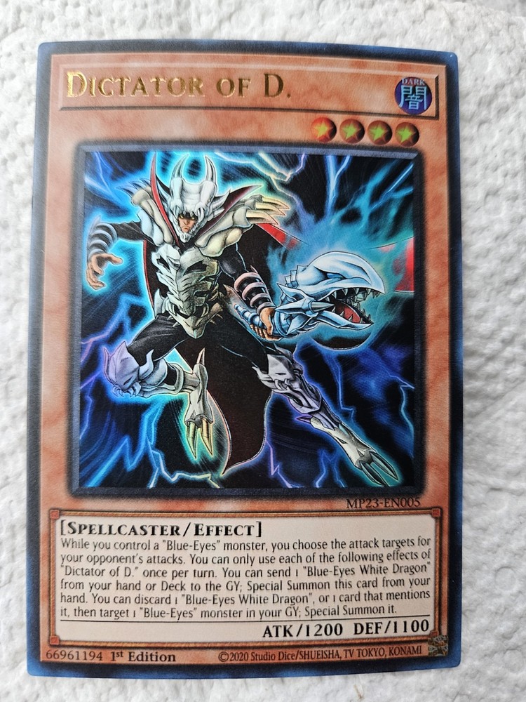 Elevate your Yu-Gi-Oh! TCG collection with the formidable "Dictator of D." card from the 25th Anniversary Tin: Dueling Heroes Mega Pack. As an effect-type monster with a unique card number MP23-EN005, this spellcaster is a must-have for any serious player or collector. Its impressive attack power of 1200 and defense toughness of 1100 make it a standout addition to your deck or display. This ultra-rare find, hailing from the renowned Konami-manufactured Dueling Heroes set, comes in the English language and is a 1st edition collectible. With its dark attribute, the "Dictator of D." card balances strategic depth for your gaming experience, ensuring it's a key piece in your collection or your next big play.
