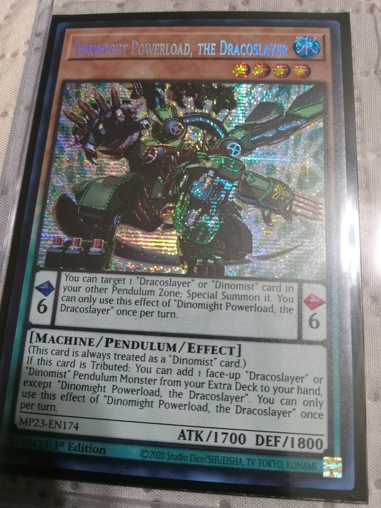 Elevate your Yu-Gi-Oh! TCG strategy with the Dinomight Powerload, the Dracoslayer card, a powerful Effect Pendulum Monster from the 25th Anniversary Tin: Dueling Heroes Mega Pack. Boasting a striking Prismatic Secret Rare rarity, this card is a standout addition to any deck. With its Water attribute and impressive 1800 Defense/Toughness, it's designed to withstand enemy attacks while waiting for the perfect moment to strike back. Card number MP23-EN174, Dinomight Powerload, the Dracoslayer, comes straight from Konami, ensuring authentic gameplay experience. The card features the unique Pendulum Effect that allows you to target a "Dracoslayer" or "Dinomist" card in your other Pendulum Zone and Special Summon it. Additionally, if this card is Tributed, you can add a face-up "Dracoslayer" or "Dinomist" Pendulum Monster from your Extra Deck to your hand, making it a versatile and dynamic play.