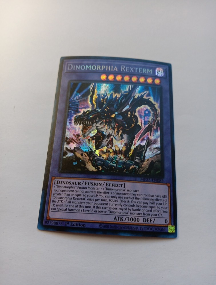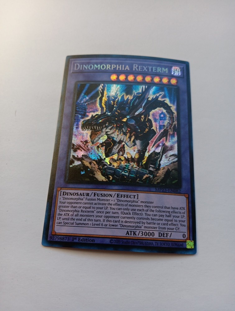The product is a Yu-Gi-Oh! TCG card named Dinomorphia Rexterm from the 25th Anniversary Tin: Dueling Heroes Mega Pack. It is a Dark Dinosaur-type Fusion Effect monster with 3000 Attack and 0 Defense. This Prismatic Secret Rare card is in English and features 1st Edition. It is card number MP23-EN082 manufactured by Konami.