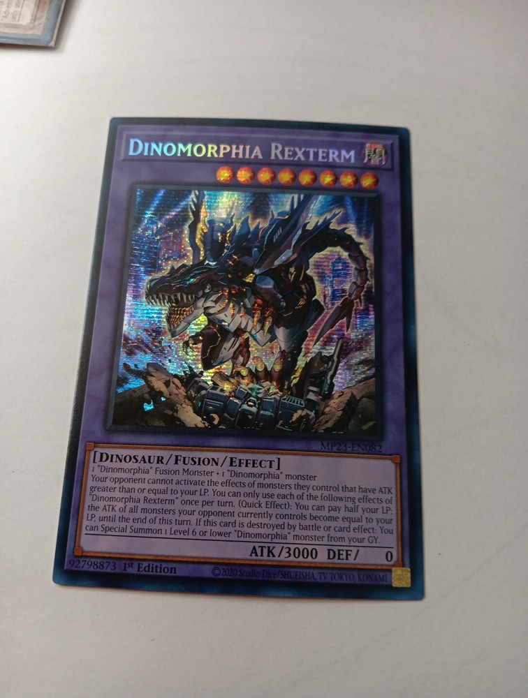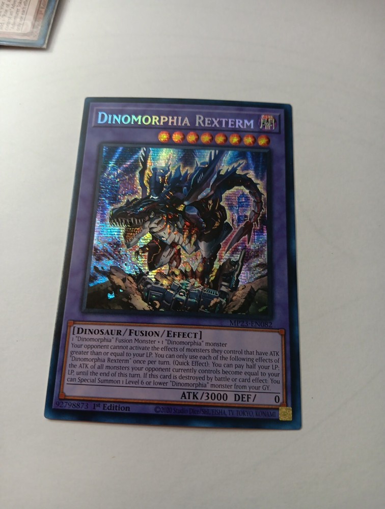 Get ready to battle with this incredible pack of Yu-Gi-Oh! TCG cards. The Dinomorphia Rexterm MP23-EN082 card is a must-have for any collector or player looking for a unique and rare card. This Prismatic Secret Rare card features a Dark attribute and a Dinosaur creature type, making it a powerful addition to any deck. With an Attack/Power of 3000 and an Effect/Fusion card type, this card is sure to cause a stir in any game. The card is manufactured by Konami and is available in English language, making it accessible to a wide audience. This 1st Edition card is part of the 25th Anniversary Tin: Dueling Heroes Mega Pack, making it a valuable addition to any collection.