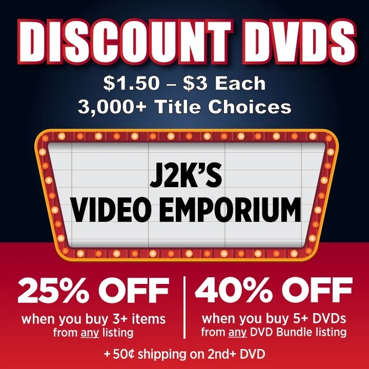 BUILD YOUR OWN BUNDLE This is a bundle listing, where you can select and add movies to your cart using the "Title" dropdown menu. I currently have 12 additional "Discount DVDs" bundle listings, wiith 3,000 titles to choose from. SPECIAL DISCOUNTS Due to the high cost of shipping, I try to be very aggressive in my discounts when you buy multiple items. Below are bulk discount offers available. SAVE 25% when you buy ANY 3+ items from my store SAVE 40% when you buy 5+ DVDs from all "Discount DVDs" bundle listing + Shipping Discount on all "Discount DVDs" bundle items $4 shipping on the 1st item 50¢ shipping on each additional item SHIPPING Movies typically ship within 24 hours upon payment, shipped USPS with full tracking. FULL TRANSPARENCY I do my best to make sure every customer is satisfied with every transaction. I welcome any questions to help in your purchase decisions. For any issues, I kindly ask that you contact me immediately so I may work to resolve. ADDITIONAL MOVIE LISTINGS I have more than 8,000 movies available. Most items are sold individually, but I also have bundle listings (such as this one) that are designed to save buyers money when buying multiple items. To check out my current movie inventory, please visit my eBay store: www.ebay.com/str/jay2thekaysvideoemporium HAPPY MOVIE HUNTING! LISTING DETAILS Along with providing photos of the actual item, below is the specific UPC list. Title UPC 1408 796019805308 (500) Days of Summer (Rental) 024543634652 127 Hours 024543736349 13 Going on 30 (Fun & Flirty Edition) 043396134119 13 Going on 30 (Special Edition) 043396014220 15 Minutes 794043516627 17 Again (WS & FS) 794043125041 2 Days in Paris 024543486688 2 Fast 2 Furious 025192297526 2 Fast 2 Furious (2-Disc Limited Edition) 025192019500 2 Fast 2 Furious (FS) 025192352027 20 Years With the Dolphins (Slim Case) 872322009968 2012 043396275171 2012 Supernova 096009970093 2016 World Series Champions: Chicago Cubs 826663172911 21 043396267183 21 Grams 025192416620 27 Dresses 024543506652 2-Movie Pack (Evel Knievel / Stunts) 826831200538 3 (2-Disc Collector's Edition) 796019795197 3 Full-Length Features, Collection 2 762747004399 3:10 to Yuma 031398221876 30 Minutes or Less 043396388130 300 012569736627 300 (2-Disc Special Edition) 085391162858 40 Days and 40 Nights 786936180862 5 Action Movies [Ed/Sweeper/Revenge/Spy] 50 Dead Men Walking 625828509803 50 First Dates (Special Edition) 043396014268 50/50 774212001116 60 Minutes: Zenyatta 885444842573 61* 026359178221 8 Mile 025192330520 80 Minutes 181582000135 88 Minutes 043396235786 99 Homes 025192326288 A Beautiful Mind (2-Disc Awards Edition) 025192145025 A Bridge Too Far 027616675729 A Chorus Line 027616884596 A Christmas Story 012569504424 A Dog's Purpose 025192395543 A Farewll to Arms (Slim) 872322000422 A Father's Revenge 881273000214 A Few Good Men (Special Edition) 043396052802 A Fistful of Dollars 027616785824 A Good Day to Die Hard 024543057062 A Good Night to Die 733807565778 A Guy Thing 027616921352 A History of Violence 794043100956 A Home at the End of the World 085393896423 A Knight's Tale (Special Edition) 043396061439 A Love Song For Bobby Long 043396038011 A Man Apart 794043652523 A Mighty Heart 097363505242 A Mighty Wind 085392771820 A Million Ways to Die in the West 025192212772 A Most Wanted Man 031398204893 A Night at the Roxbury (Special Collector's Edition) 097361224244 A Nightmare on Elm Street (Rental Edition) 794043140976 A Path to Happiness 633023210097 A Perfect Getaway 025192035715 A Place to Grow (Slim Case) 842718000855 A Prairie Home Companion 794043105418 A Real American Hero (Slim) 872322001917 A River Runs Through It 043396039339 A Single Man 043396353831 A Star Is Born (2018) 883929695751 A Tattered Web 090328903152 A Texas Funeral 658149780620 A Time to Kill 085391431725 A Very Harold & Kumar Christmas 794043152245 A Walk to Remember 085392242023 Abduction 031398147558 About a Boy 025192197925 About Schmidt 794043631924 Abraham Lincoln (Slim Case) 872322002358 Accepted 025192885327 Across the Universe 043396330221 Across the Universe (2-Disc Deluxe Edition) 043396194656 Act of Valor 024543781042 Action Double Feature [Matador/Lucky # Slevin] 883476080017 Active Stealth 024543055679 Adam Sandler Laugh Out Loud Double Feature 043396461345 Adaptation 043396076013 After Sunset 794043776328 Agent Cody Banks (Special Edition) 027616887412 Akeelah and the Bee 031398197805 Alex Cross 025192177156 Alexander (Director's Cut) (FS) 085393893729 Alfie 097363417545 Alfred Hitchcock Thrillers [3 Movies] 826150201025 Alfred Hithcock: A Legacy of Suspense [20 Movies] 683904524270 Ali 043396066892 Alien Vs. Predator 024543157168 All About Steve 024543533337 All Eyez On Me 31398270515 All You've Got 097368897144 Almost Famous 667068781823 Along Came a Spider 097363365143 Along Came Polly 025192442926 Alpha Dog 025193250520 Always 025192055621 Amazing Grace 024543444992 American Beauty 667068538229 American Dreamz 025192886324 American Gangster (2-Disc Unrated Extended) 025193228024 American Gangster (Unrated Extended) 025195055703 American Graffiti (Special Edition) 025195051026 American Guns (13-Part Documentary Series) 683904545985 American History X 794043473920 American Hunter - Pure Whitetail American Idol: The Search for a Superstar 823753900294 American Me 025192057427 American Pie 2 (Collector's Edition) (FS) 025192148927 American Pie: Band Camp (Unrated) 025192744723 American Wedding (Extended Unrated Edition) 025192379925 America's Funniest Home Videos: Kids & Animals 826663948714 America's Sweethearts 043396063938 An American Haunting (Unrated) 012236201410 An American In Paris 883929157778 An Inconvenient Truth (Slim Paper Case) 097363480846 An Officer And a Gentleman 097360146745 Anacondas 043396032590 Analyze This & That Double Feature 085391170143 Anchorman: The Legend of Ron Burgundy (Unrated) 678149167726 And Starring Pancho Villa As Himself 026359212321 Angel Has Fallen 031398309130 Angels & De