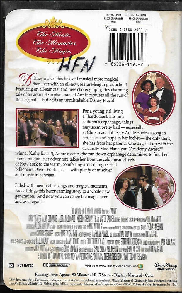 Disney Annie, Musical 1990 VHS * NR * Walt Disney Home Video * 90 Minutes We seem to be conservative in our rating system compared to others, but we feel better giving you more than you expect. Media mail is the least cost but may take more than 9 days. We mail within one business day of receiving payment. VHS is in it's original paper cover but has been watched. The back cover has water marks and initials written. Please check our store for more selections. Pictures are as true to color as possible, but your screen may display differently. ******************************************* Business and return Policy : We strive to be a 5 Star seller. Please let us know if you have any concerns. We will be happy to combine shipping. Please let us know if you are bidding on, or planning to buy something else. Thanks For Looking! Powered by SixBit's eCommerce Solution