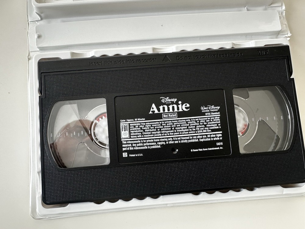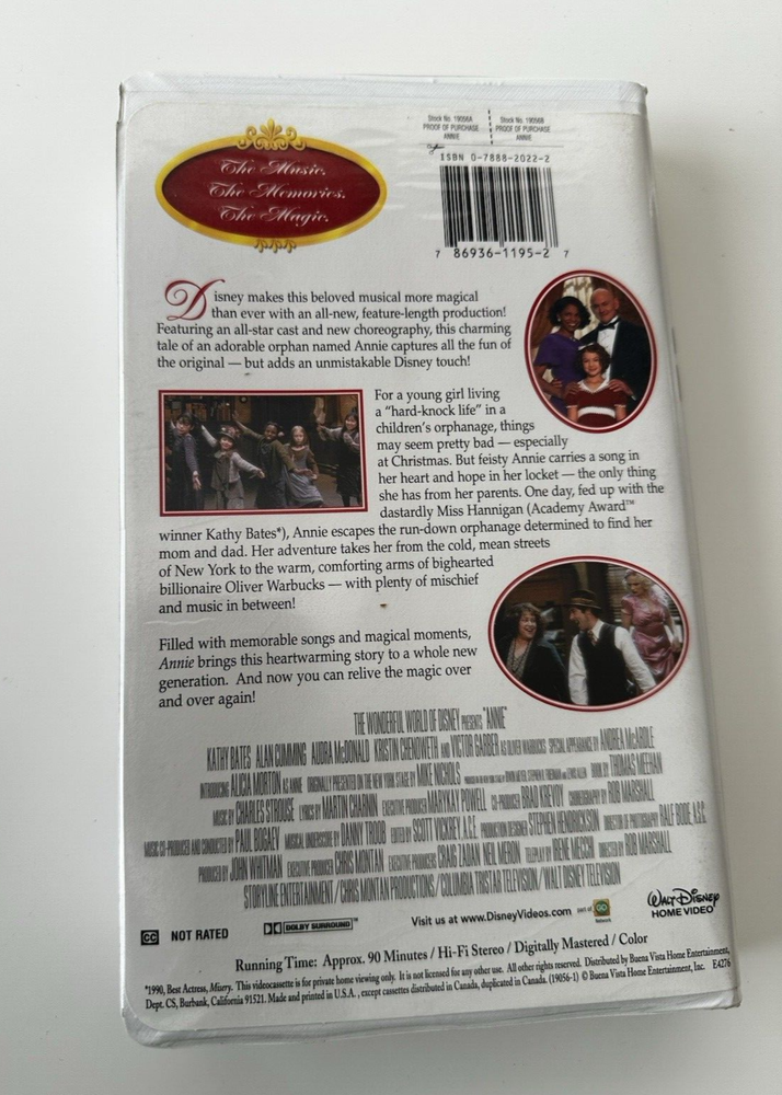 The VHS tape "Annie" from 2000, directed by Rob Marshall, is a children's & family musical film featuring leading roles played by Victor Garber, Alicia Morton, Alan Cumming, and Kathy Bates. The movie is in NTSC signal standard and falls under the sub-genres of Musicals and Live-Action.