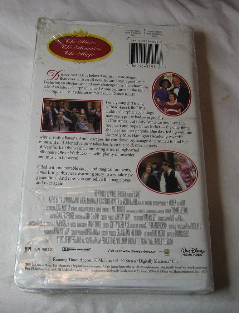 Disney Presents Annie VHS, 2000 Classic Musical Condition New in Box - Sealed Shrink Wrap Has Some Scuffs / Scratches / Tears / Dings (see pictures) About As seen on "The Wonderful World of Disney", this new production of the classic musical features an all-star cast belting out the beloved songs. Original Broadway Annie Andrea McArdle makes and appearance, too! Fun for the whole family. Product Details Number of Tapes: 1 Rating: Not Rated Film Country: USA UPC: 786936119527 Additional Details Genre: Childrens Format: VHS Thanks For Looking Have a Great Day