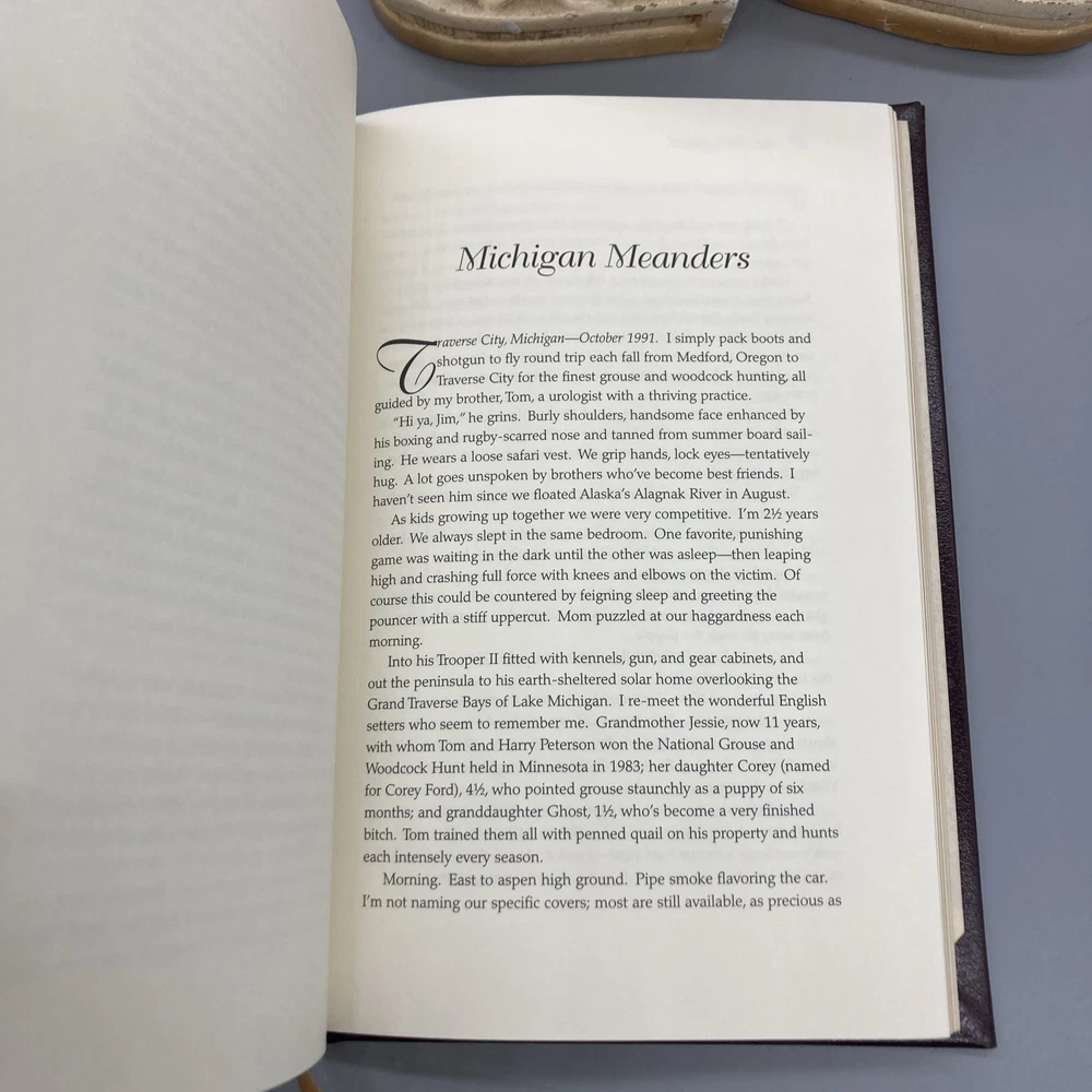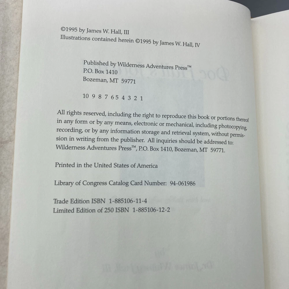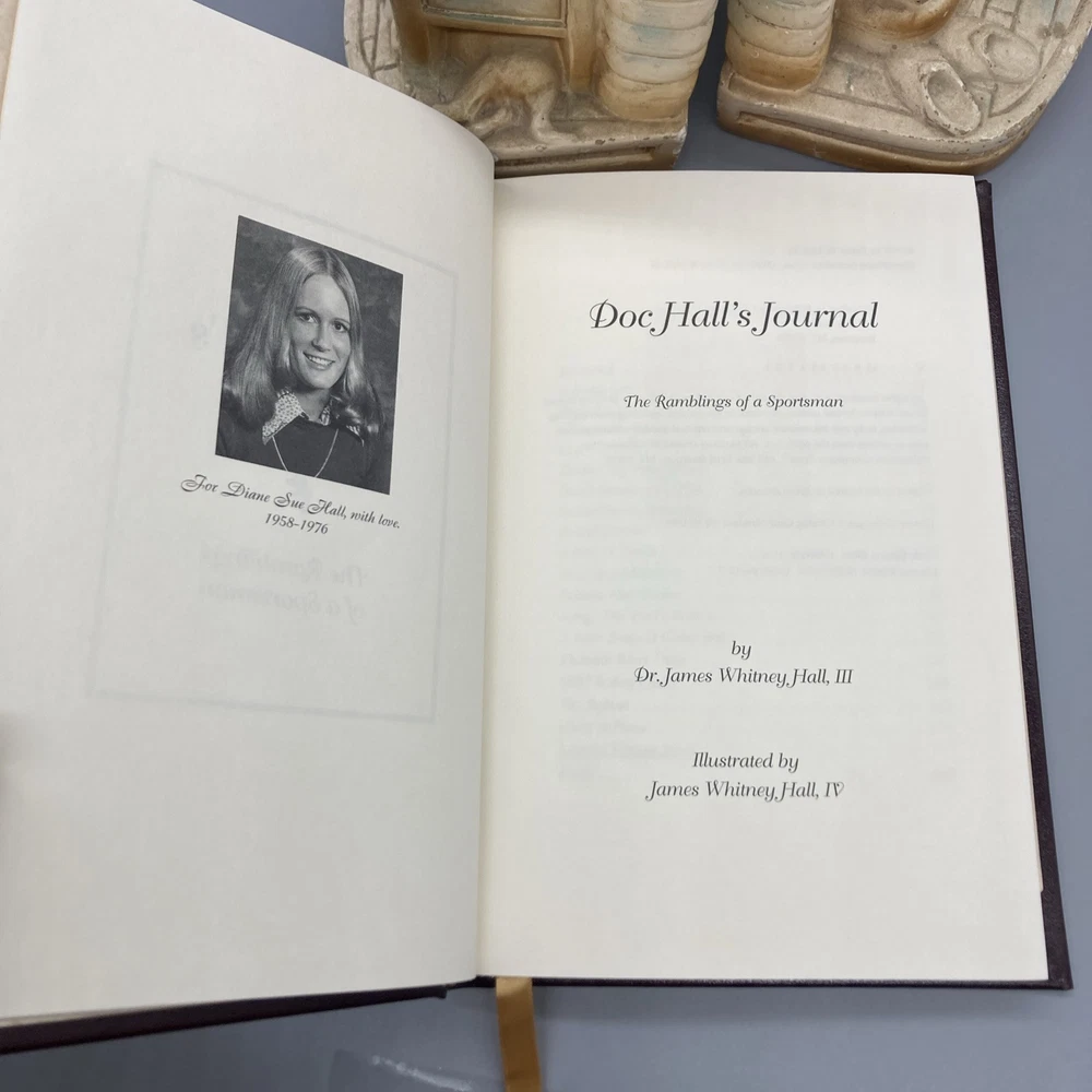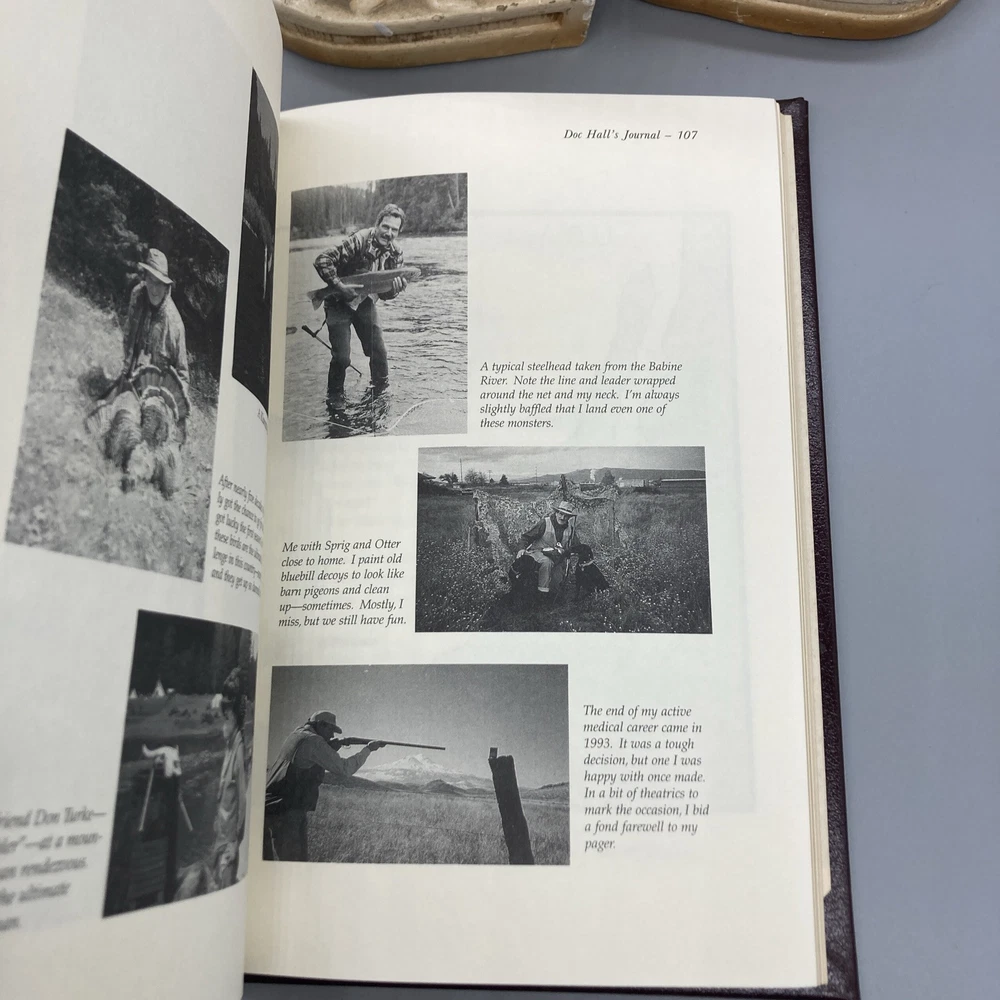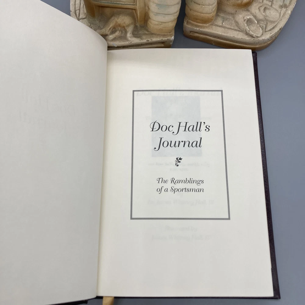 The product is a limited edition leather-bound book titled "Doc Hall's Journal" by James A. Hall IV and James A. Hall III. It is illustrated and published by Wilderness Adventures Press, Incorporated in 1995. The book features the ramblings of a sportsman and is a collectible item.
